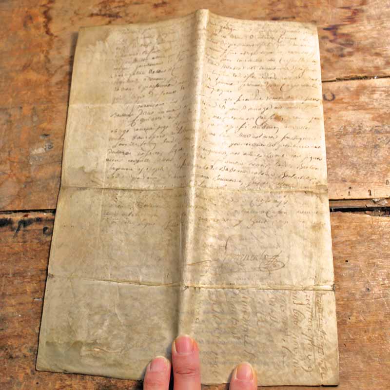 200年以上前の古い古文書。羊皮紙の珍しいものです。ブルターニュの公文書のハンコが押してあります。 この書類はロアール地方のシャトー Bois Benoit から来たものです。古いものなので、傷、汚れがあります。
