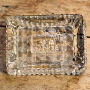 古いガラス製の容器。切手を置いたりペンを置いたりして使っていたそうです。古いものなので裏側のふちに小さな欠けがあります。