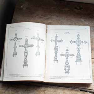 非常に珍しい、教会用道具のカタログ。十字架、キリスト様やマリア様像をはじめ、ガーデンの門や、ドアなどを網羅しています。どの商品にもキリスト教のモチーフが使われており、資料として貴重なものだと思います。古いものなので傷、汚れ、本の歪み等があります。