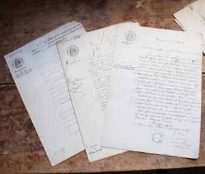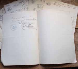 19世紀の古文書を10枚セットにまとめたもの。10枚ですが、1枚が2つ折りになっていますので、20枚とカウントできます。最初のページだけ文字が書かれていて、2枚目は使っていないものです。古いものなので傷、汚れがあります。