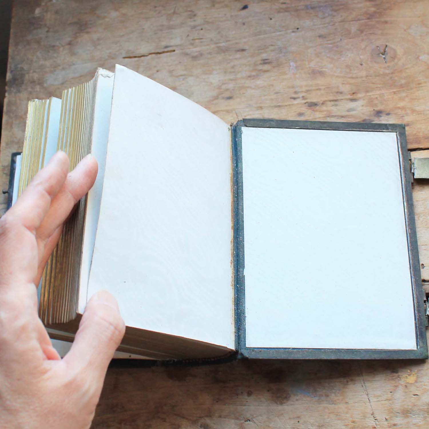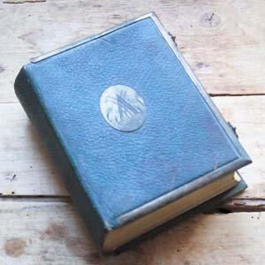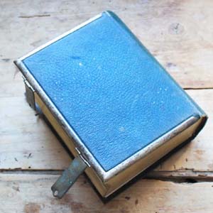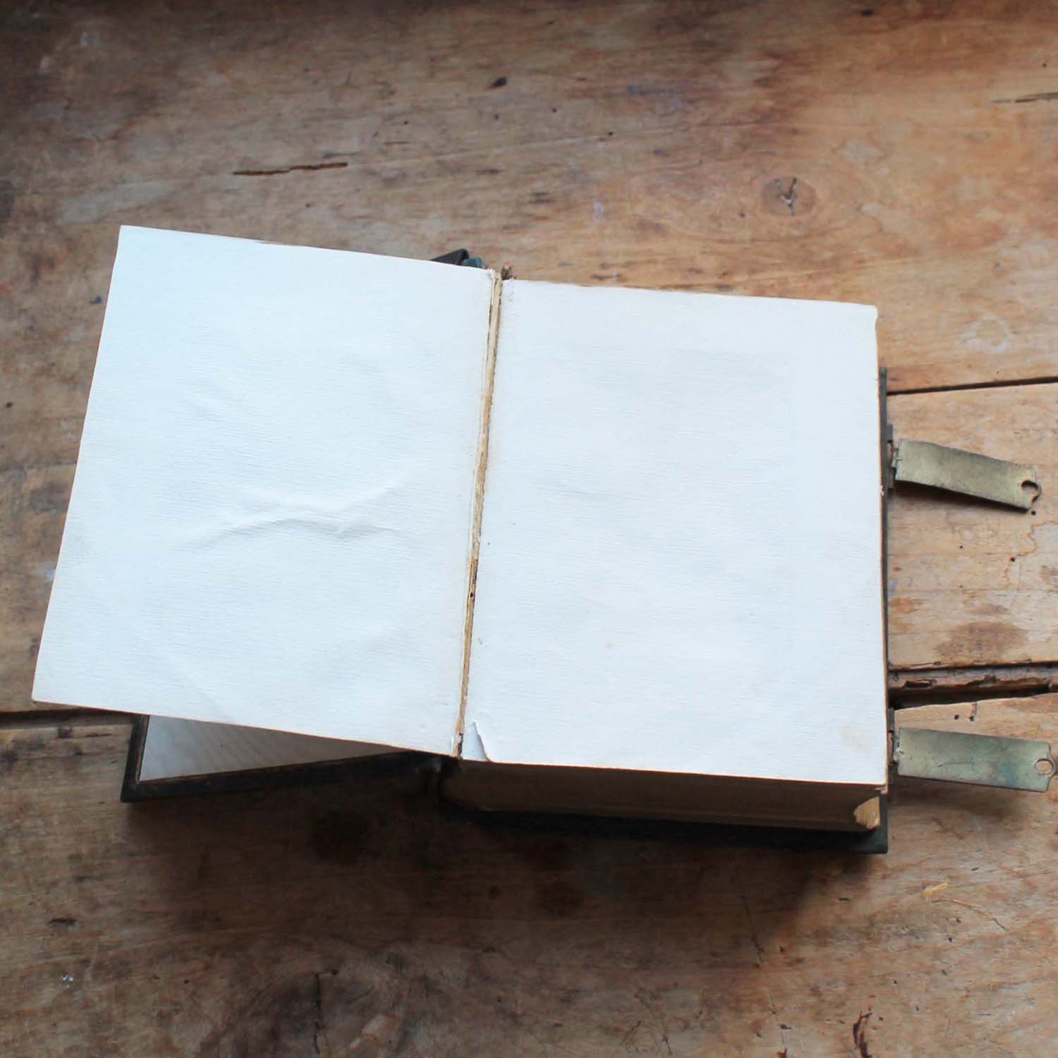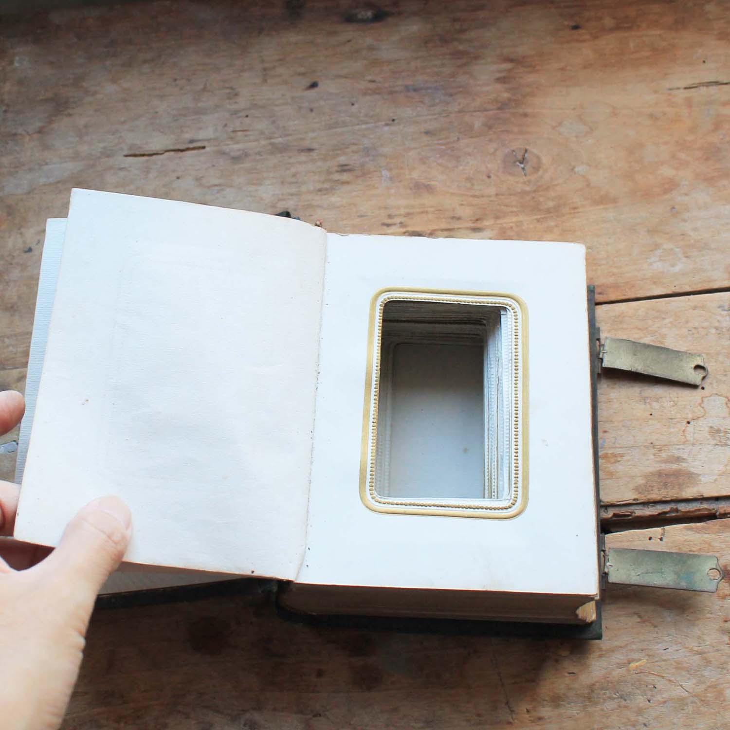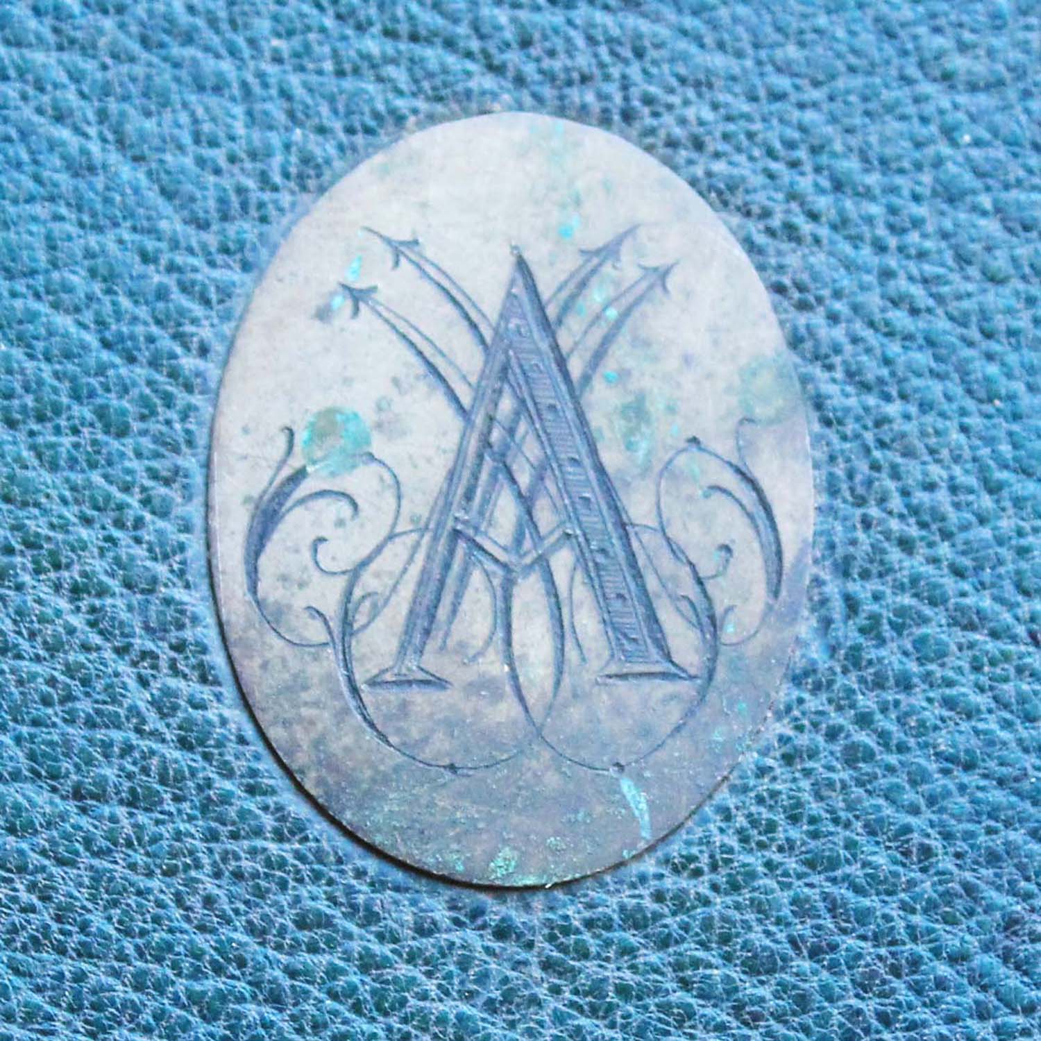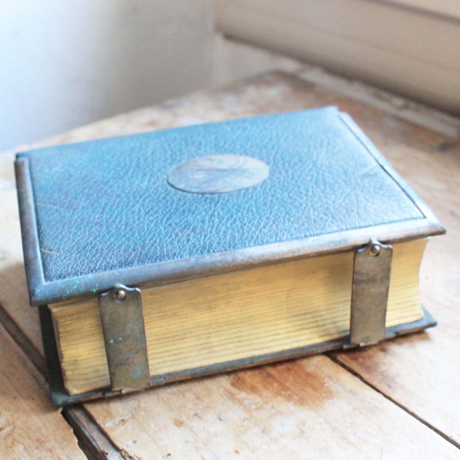 100年以上前の古い写真アルバム。表紙に真鍮製のイニシャルモチーフがついています。古いものなので多少の傷、汚れがあります。