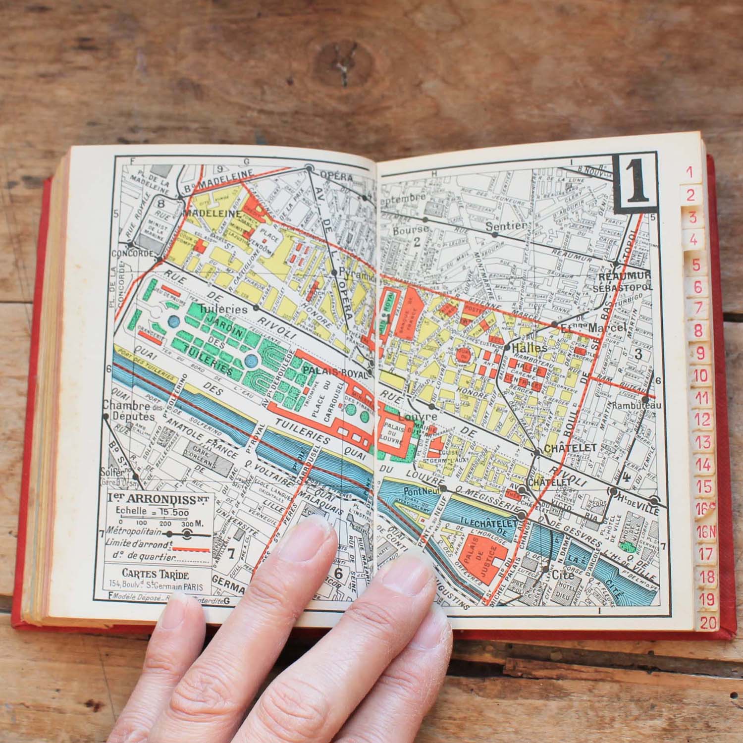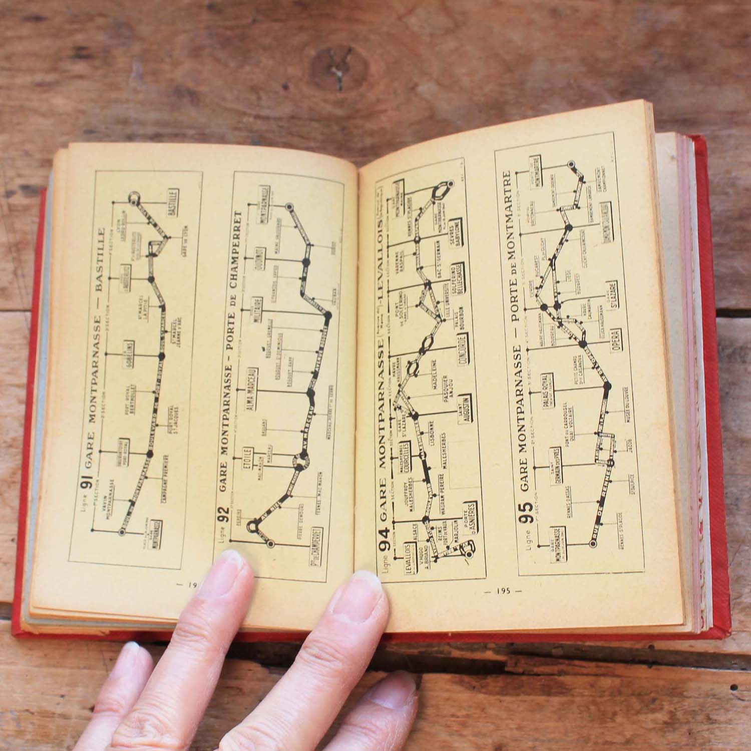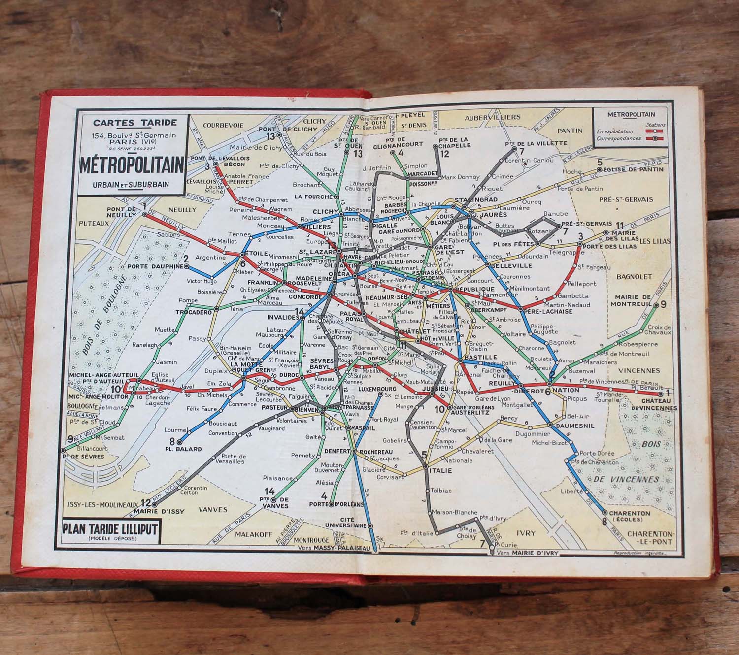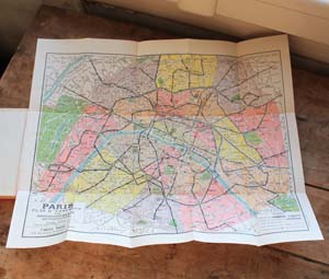 1955年版のパリの地図。住所から地図を探せます。またパリの交通機関、パリの大きな地図もついています。古いものなので多少の傷、汚れがあります。