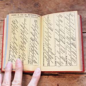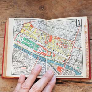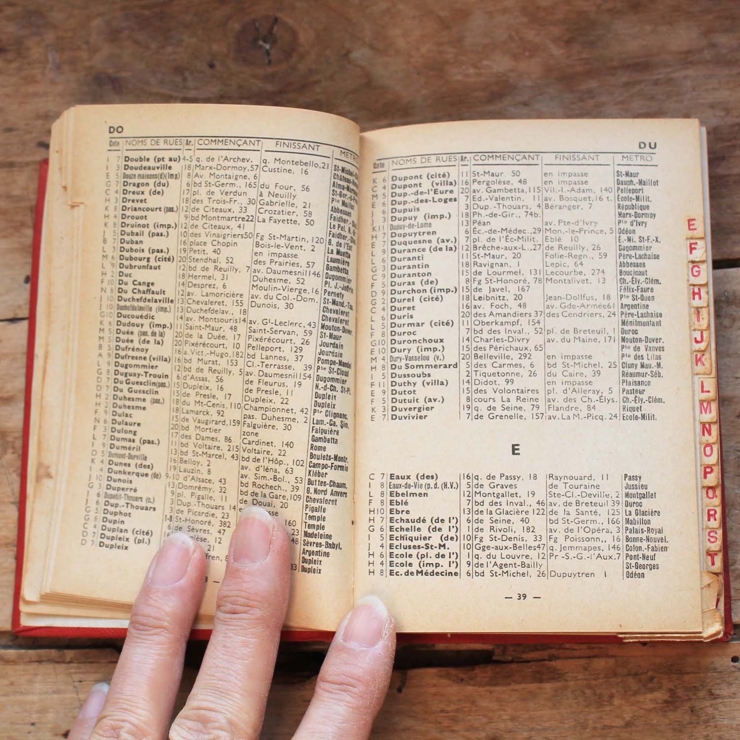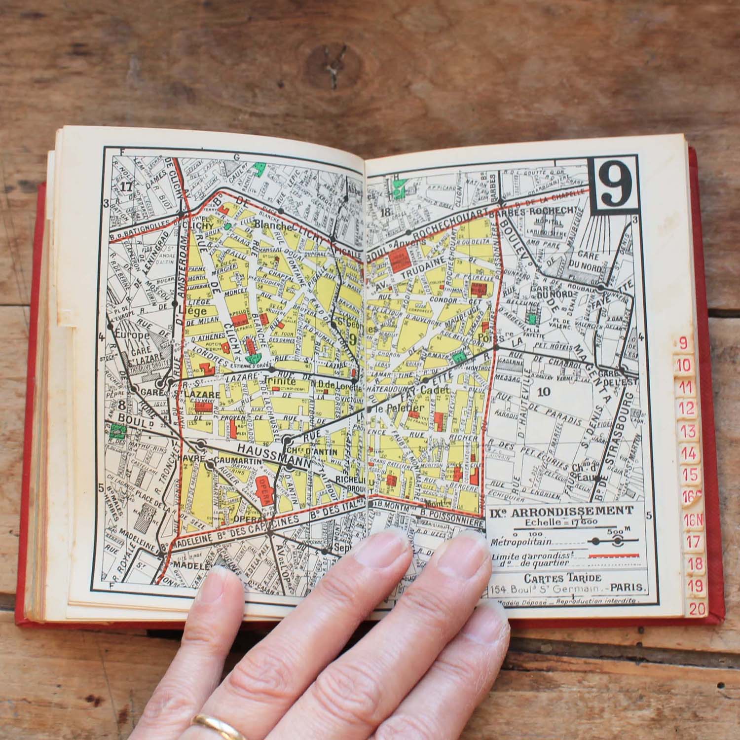 1955年版のパリの地図。住所から地図を探せます。またパリの交通機関、パリの大きな地図もついています。古いものなので多少の傷、汚れがあります。