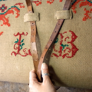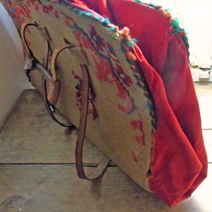 キャンバス地のしっかりとしたつくりのカバン。 絵などを入れたものではないかと思います。内側は布製の2重カバンになっており、ものが落ちないようになっています。 持ち手は革製です。 刺繍の取れたところ、内側のカバンの口を閉める紐が取れています(付け替え可能)が使用できます。