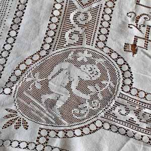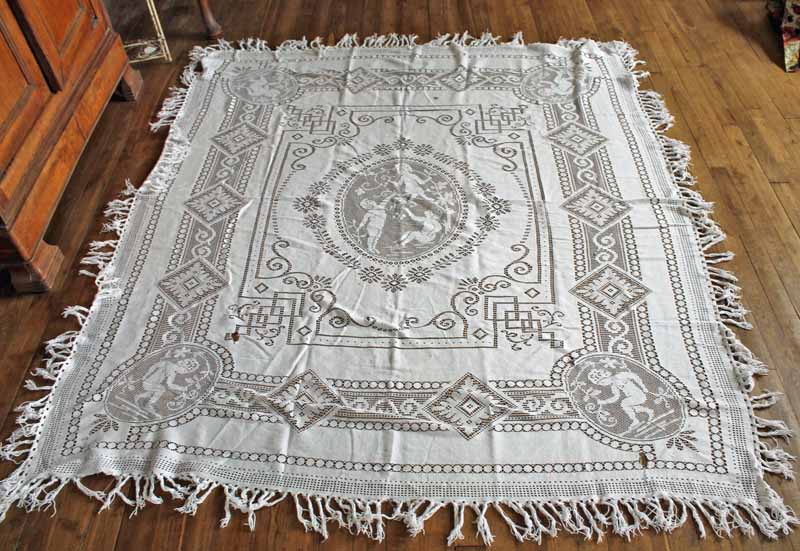 エンジェル(赤ちゃん?)のモチーフが使われている素敵なコットンレース布。 ベッドカバー用です。 古いものなので多少の穴、切れ、シミがあります。