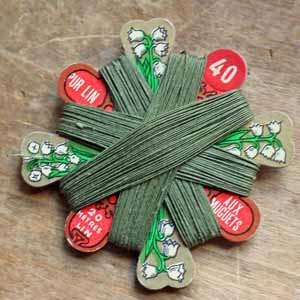 古いリネン糸&カード。デッドストックです。 ソーインググッズの本にも載っているかわいいものです。 スズランのモチーフがとっても素敵です。糸を使い終わると、中から女性の姿が見える、凝ったものです。古いものなので、多少の傷、汚れがあります。