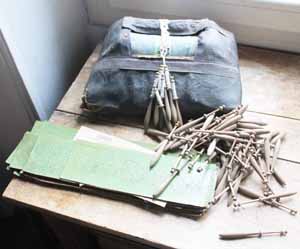 100年ぐらい前の古いボビンレースの製作グッズ。 ピローはキャンバス地+木でできています。 ボビンは60本以上ついています。レースのデザインはすべて手作りで16枚付いています。ボビンだけでもこのお値段はお安いと思いますが、それにピロ―+デザイン付と大変お得になっています。古いものなのでピローに多少のダメージ、全体的に汚れ、傷があります。