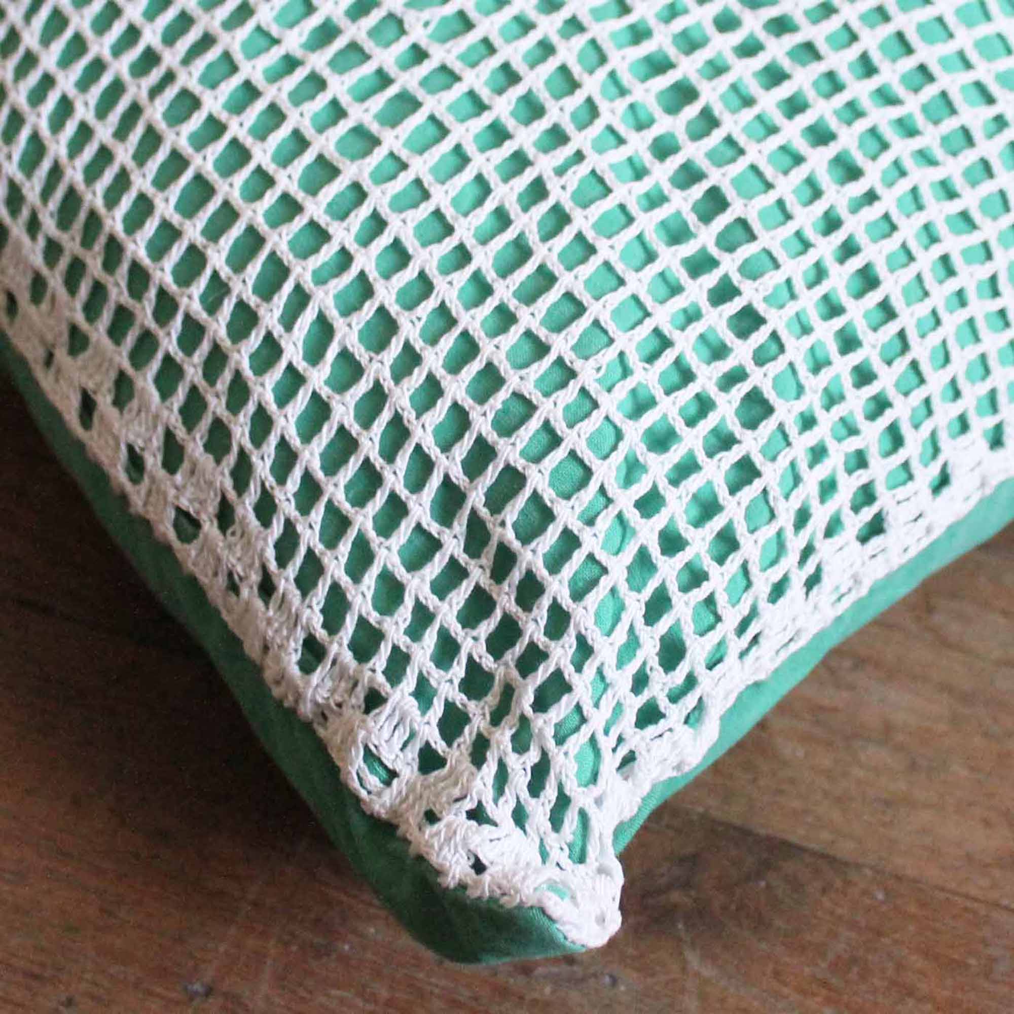 フィレレースのエンジェルがかわいいクッションカバー。ハンドメイドです。古いものなので多少の汚れがあります。