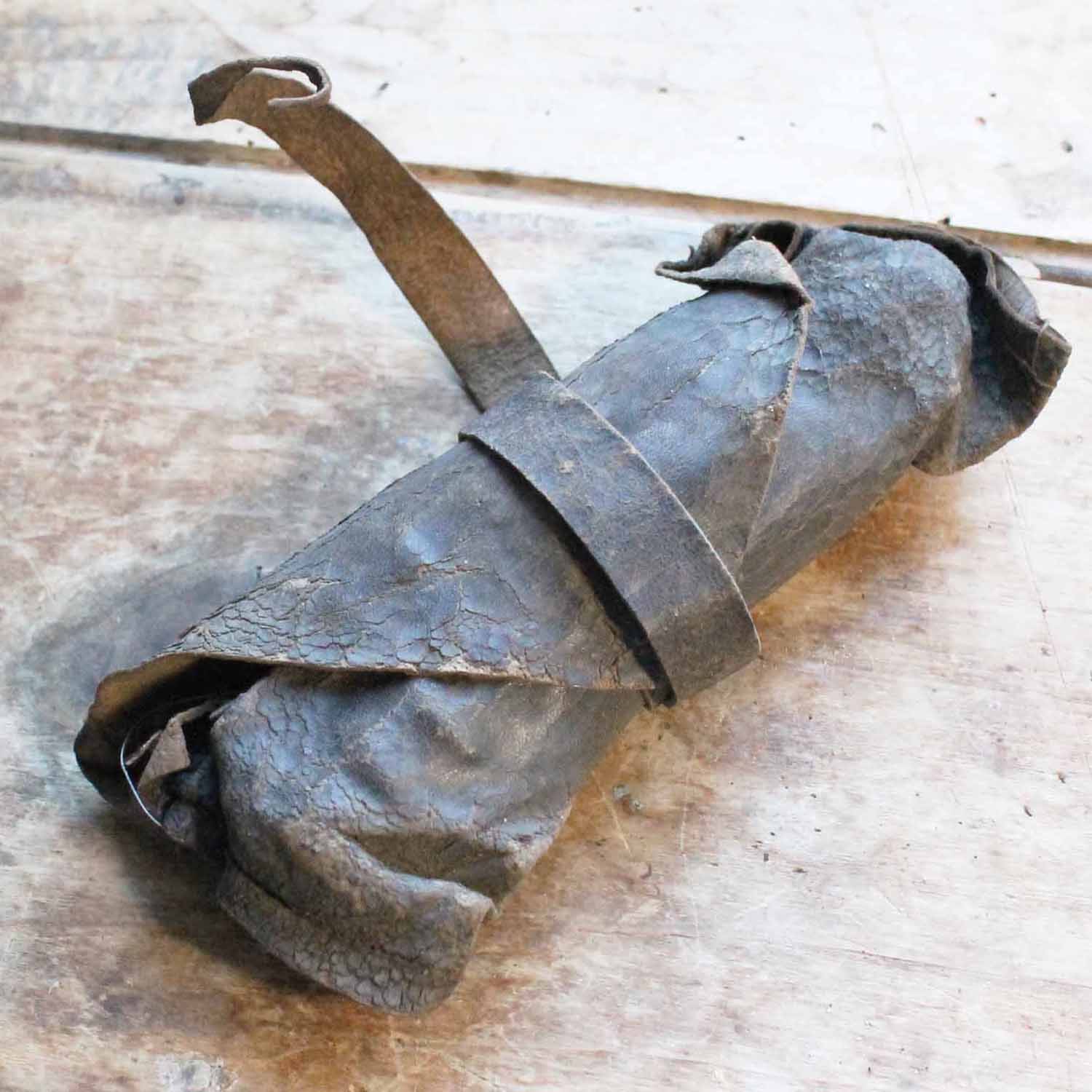 革の袋がついているのが珍しい、フランス軍のソーイングキット。 古いものなので鉄の物にはさびが入っています。