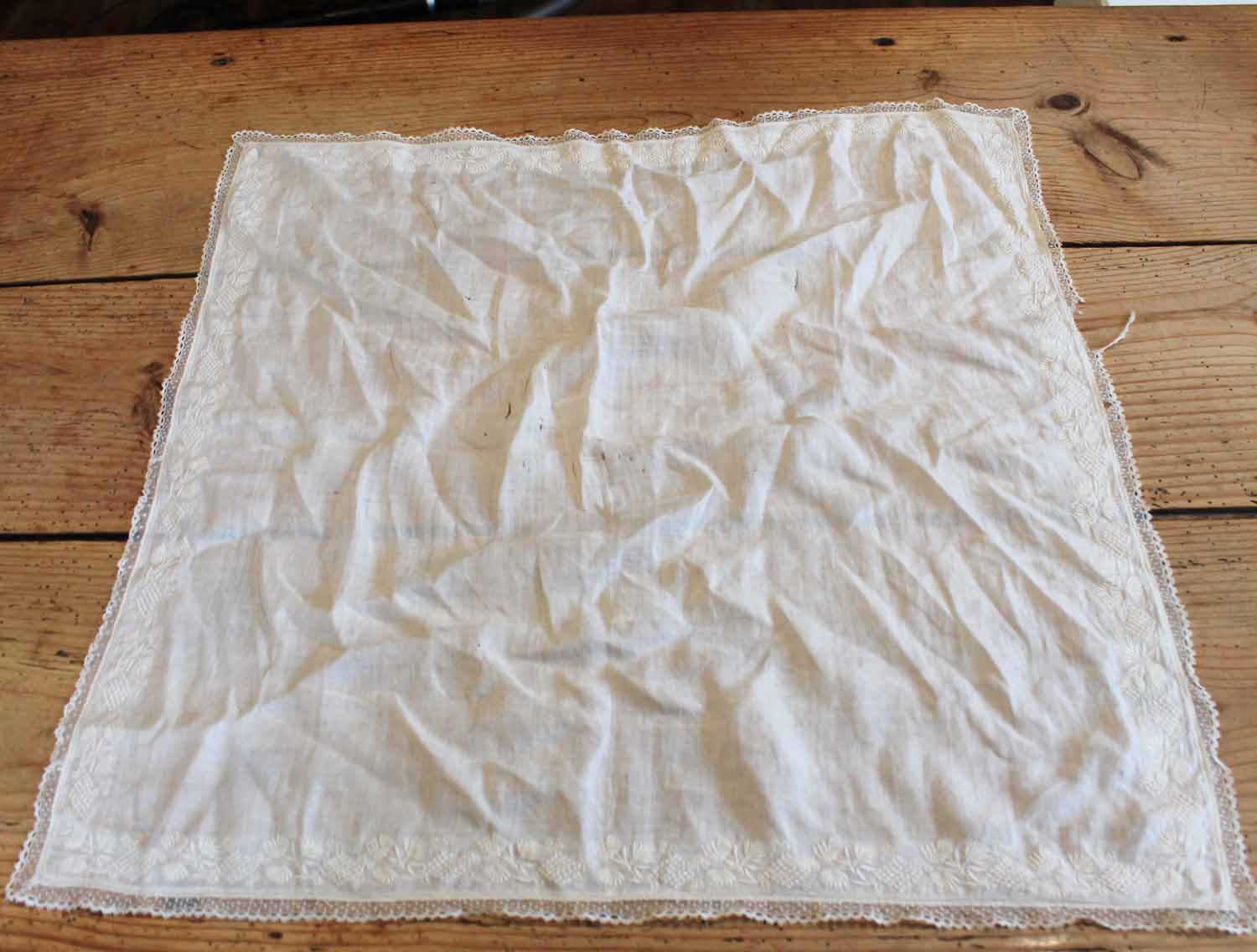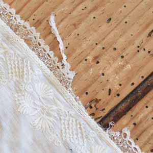 100年以上前の古いコットン製の布。淵にレース&手刺繍が入っています。古いものなので多少の切れがあります。