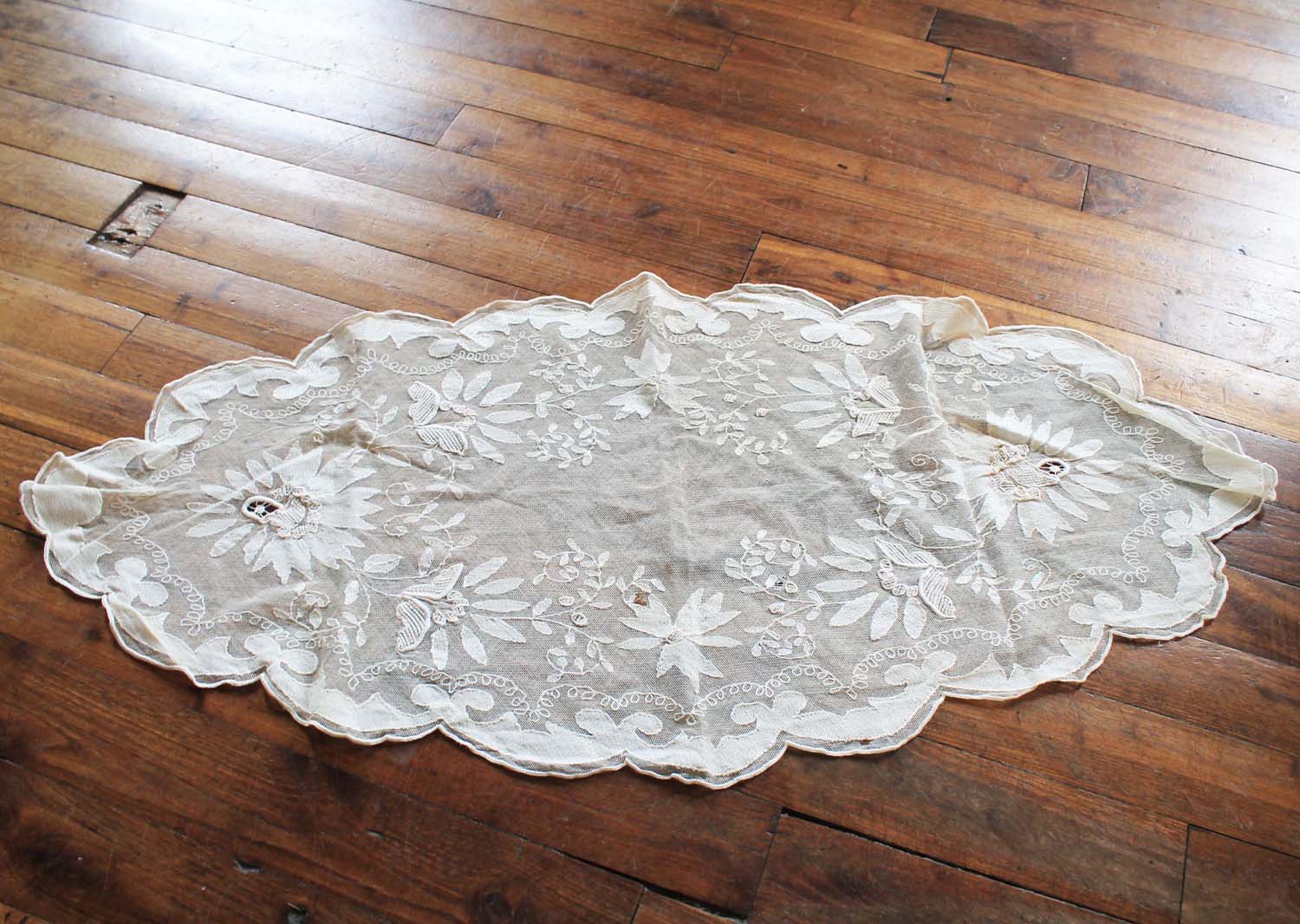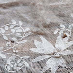 古いチュールのテーブルセンター? スカーフかもしれません。手刺の刺繍入り。古いものなので多少切れ、汚れがあります。