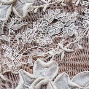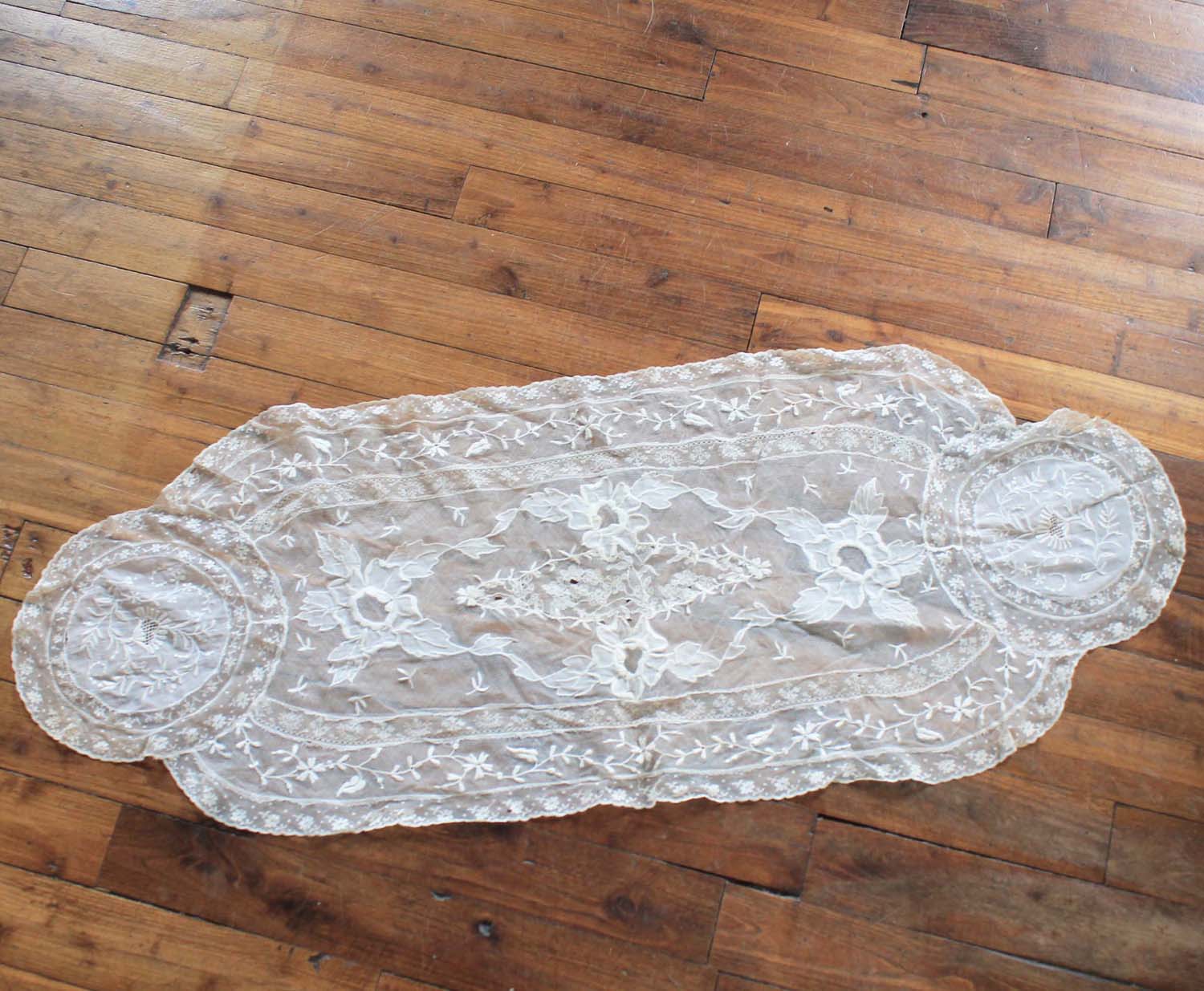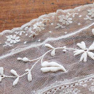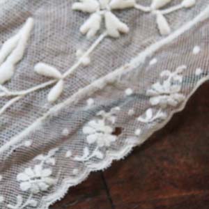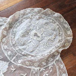 古いチュールのテーブルセンター? スカーフかもしれません。手刺の刺繍入り。古いものなので多少切れ、汚れがあります。