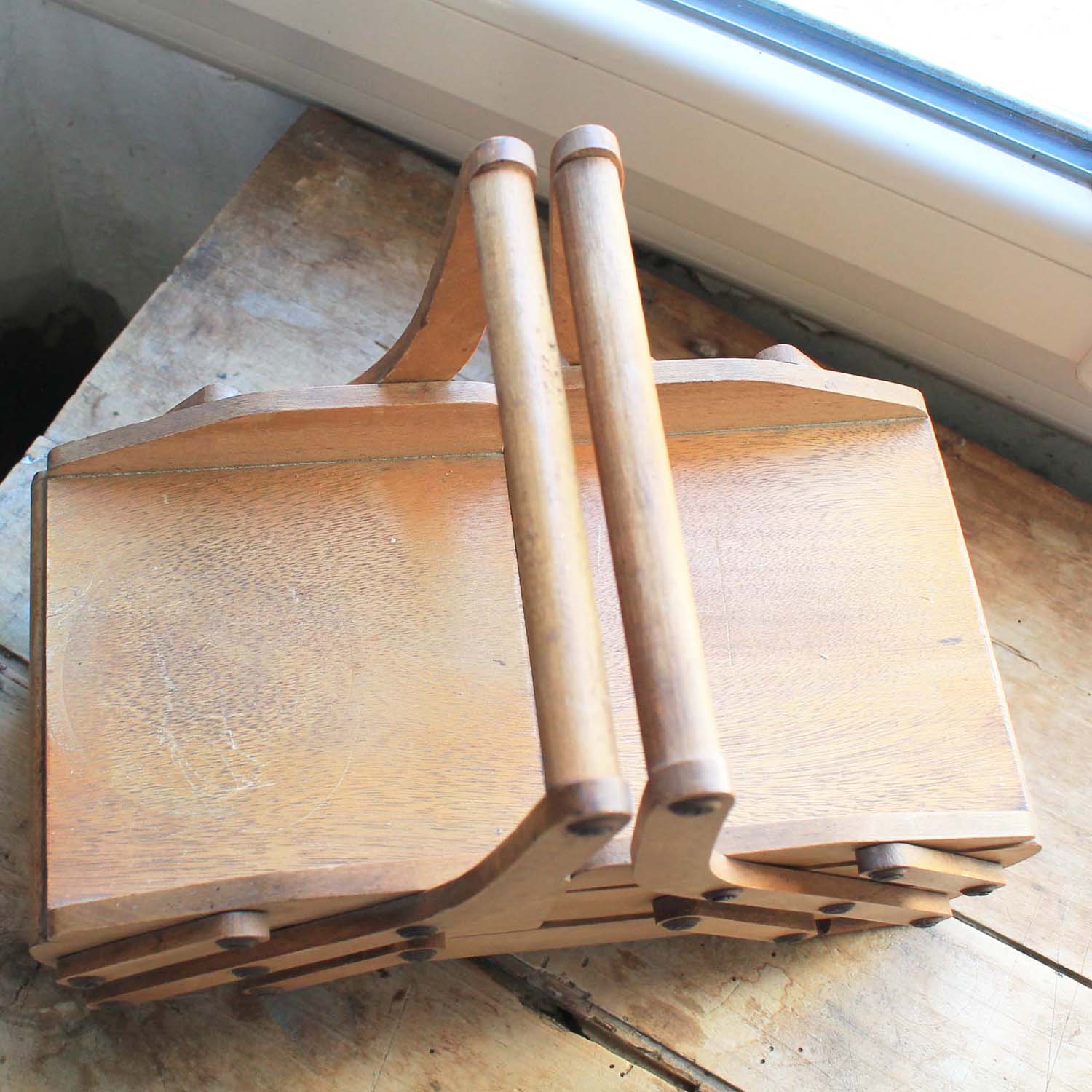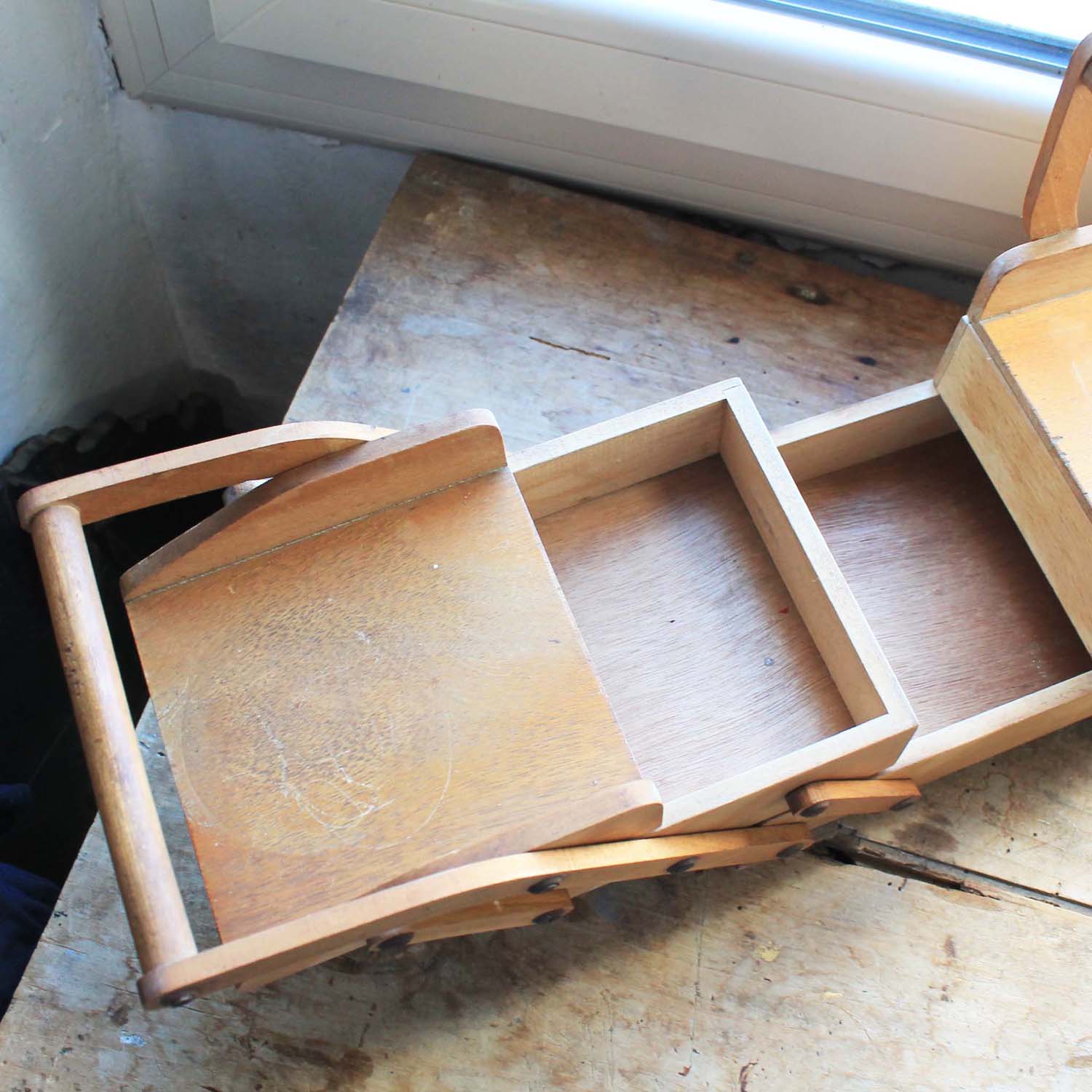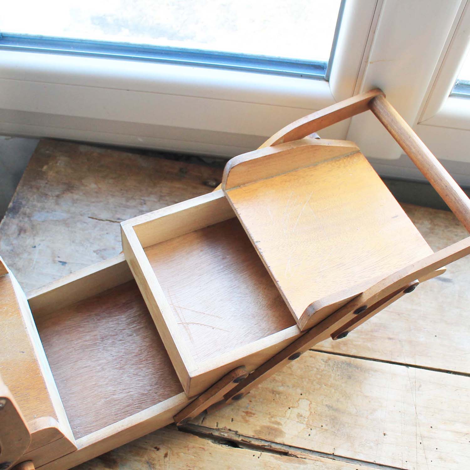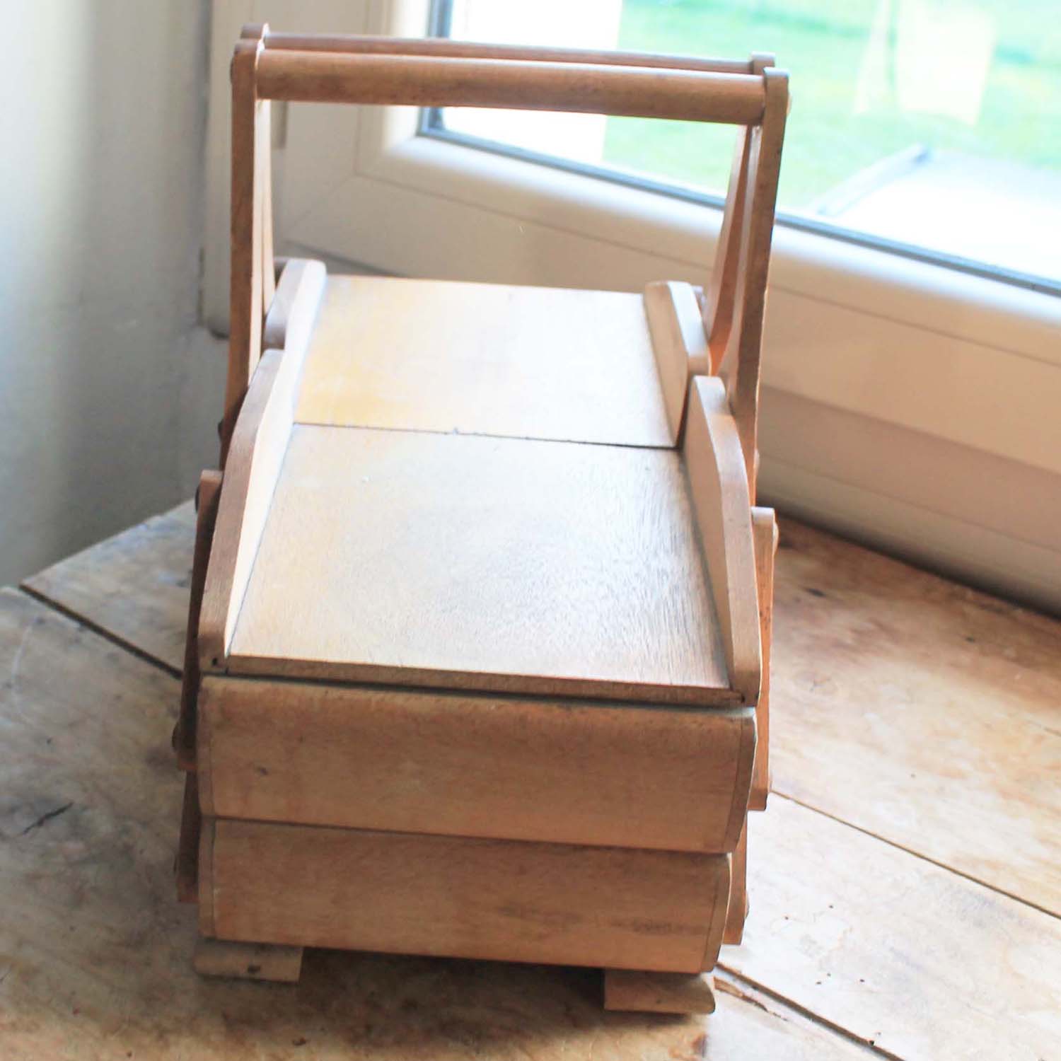 古い木製のソーイングボックス。古いものなので多少の傷、汚れがあります。