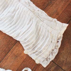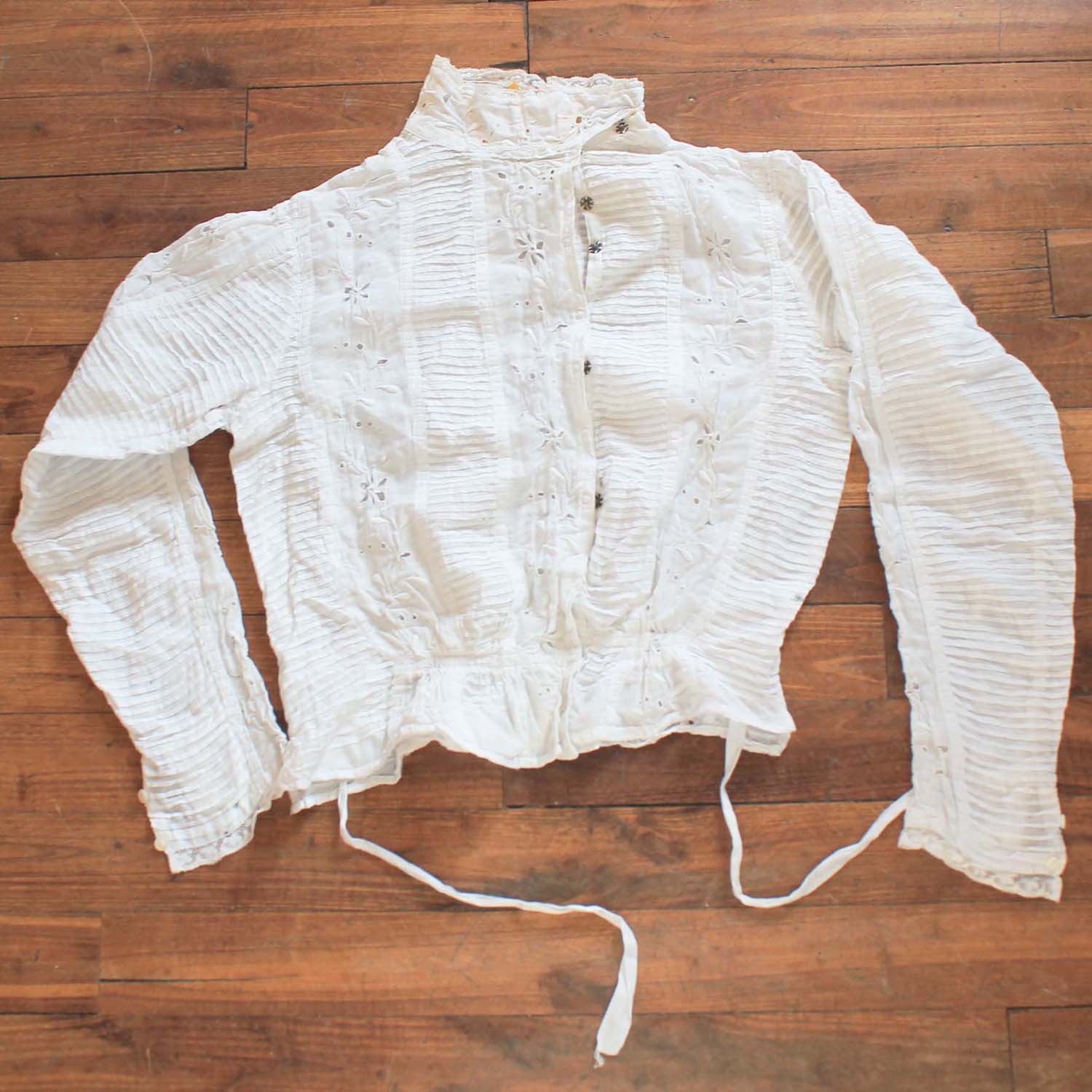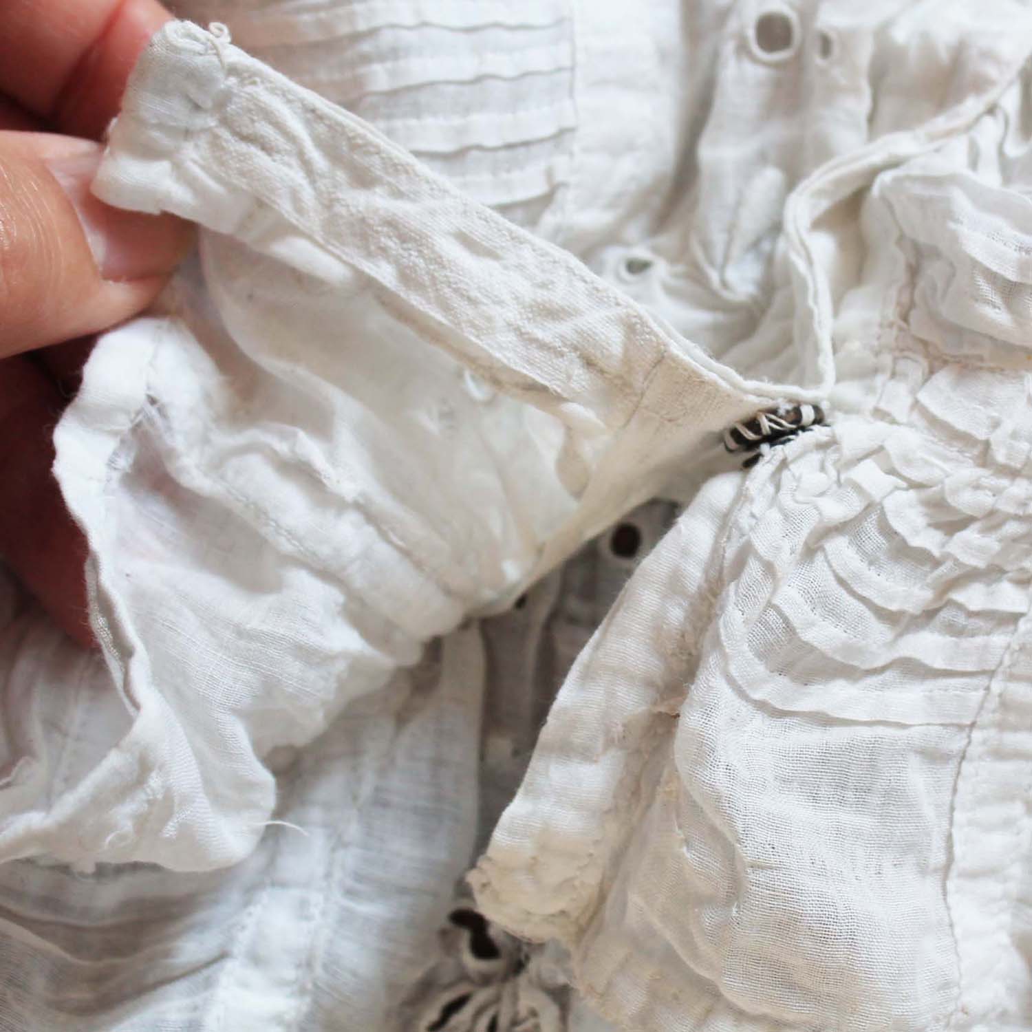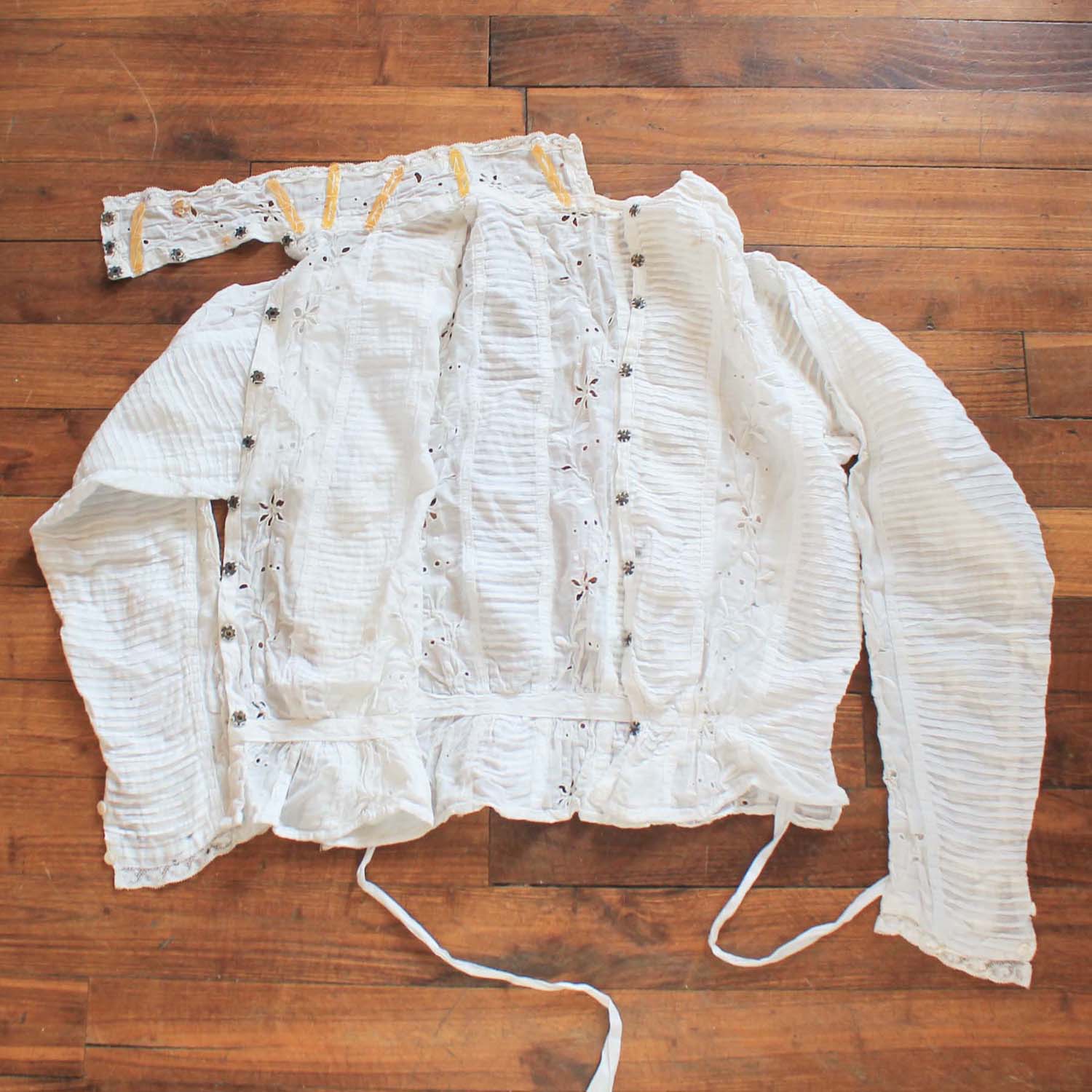 100年ぐらい前の古いコットン製のブラウス。 ブルターニュ地方の民族衣装のものだと思います。古いものなのでスタンドカラーの裏についているシートの一つにダメージがあります。また多少のシミがありますが、切れはありません。