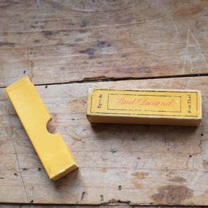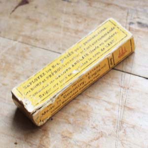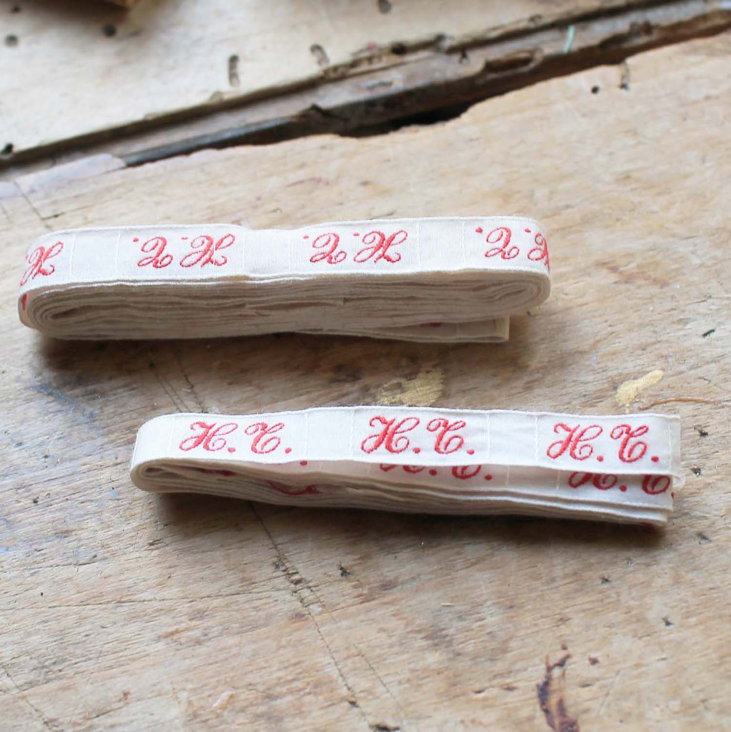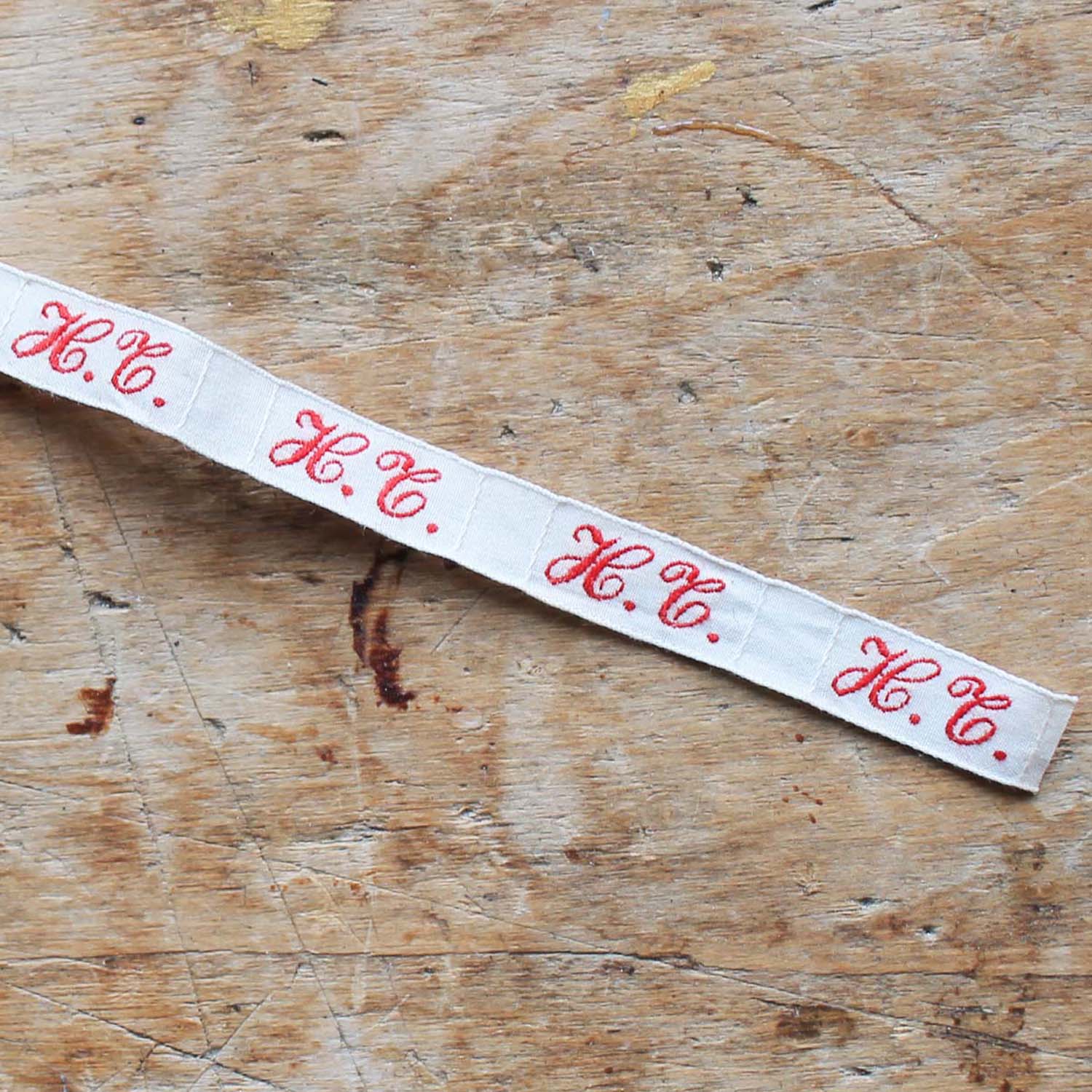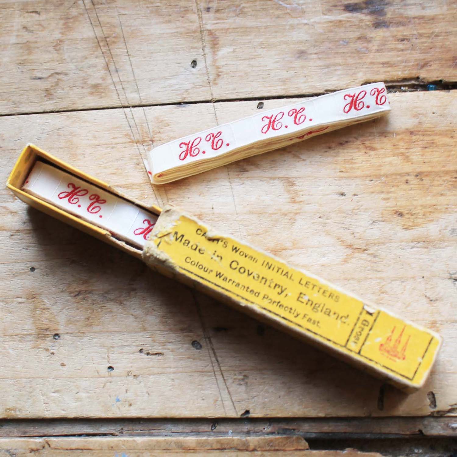 紙箱付のイニシャルテープ。イニシャルテープ自体は2本あって83㎝と160㎝です。古いものなので箱に多少の汚れがありますが、テープはきれいです。