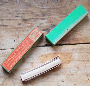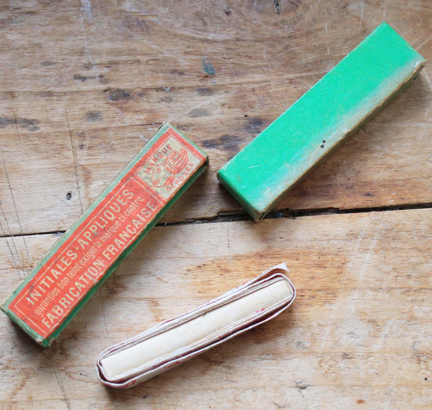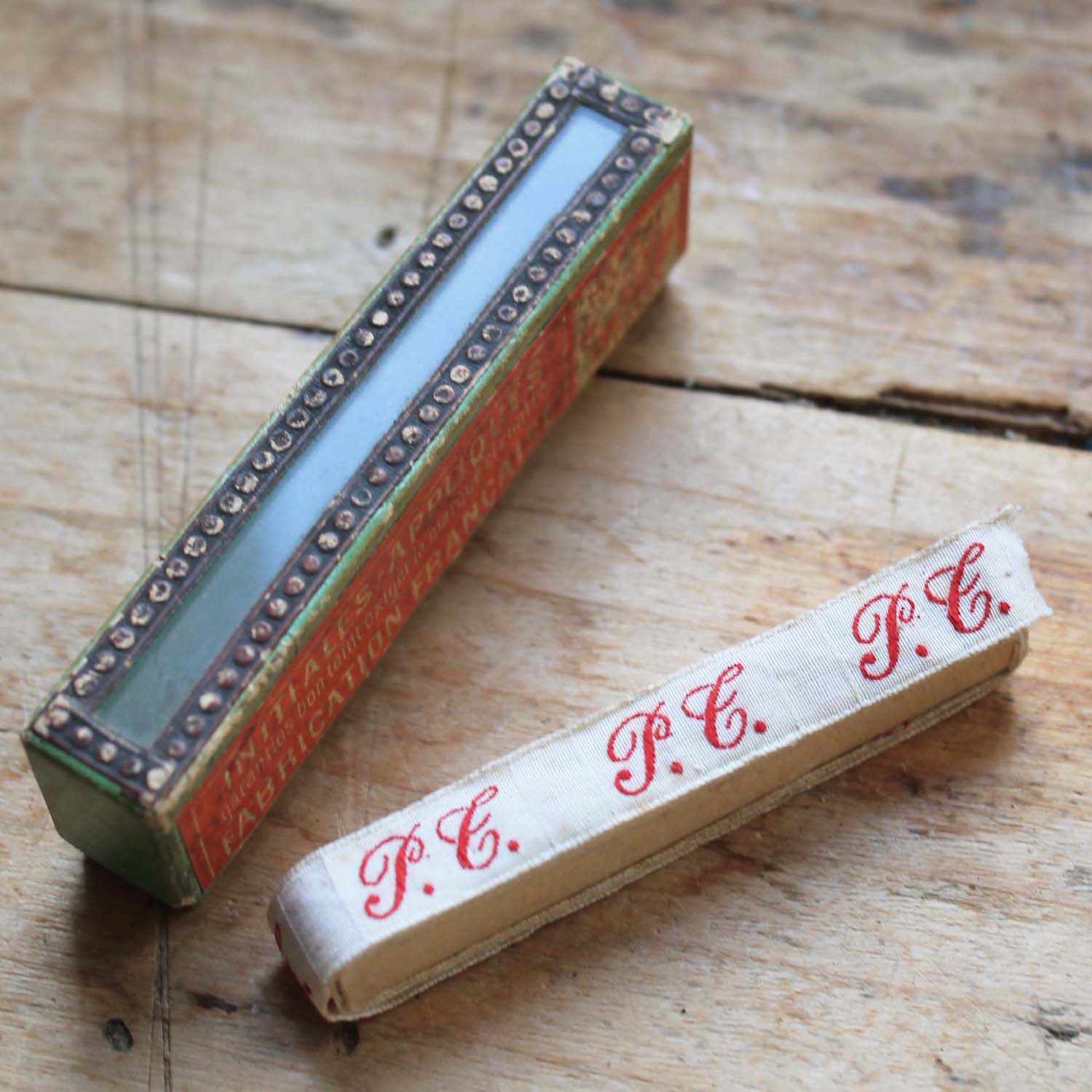 ガラス窓付きの紙箱がとても珍しいイニシャルテープ。イニシャルテープ自体は55㎝です。古いものなので箱に多少の汚れがありますが、テープはきれいです。