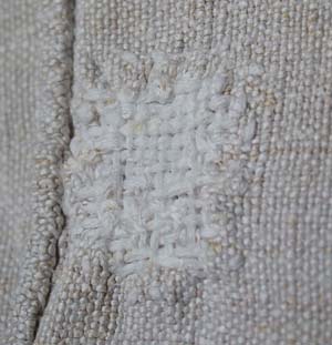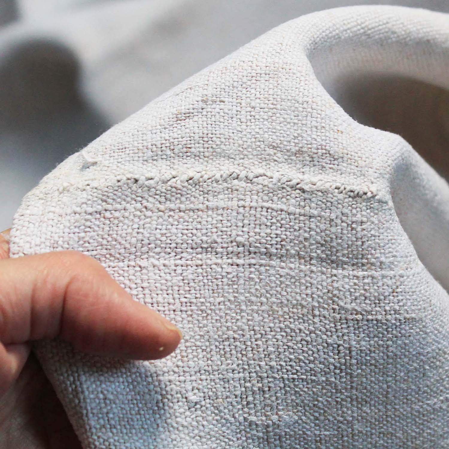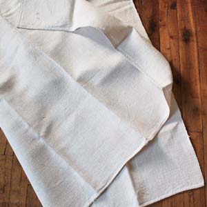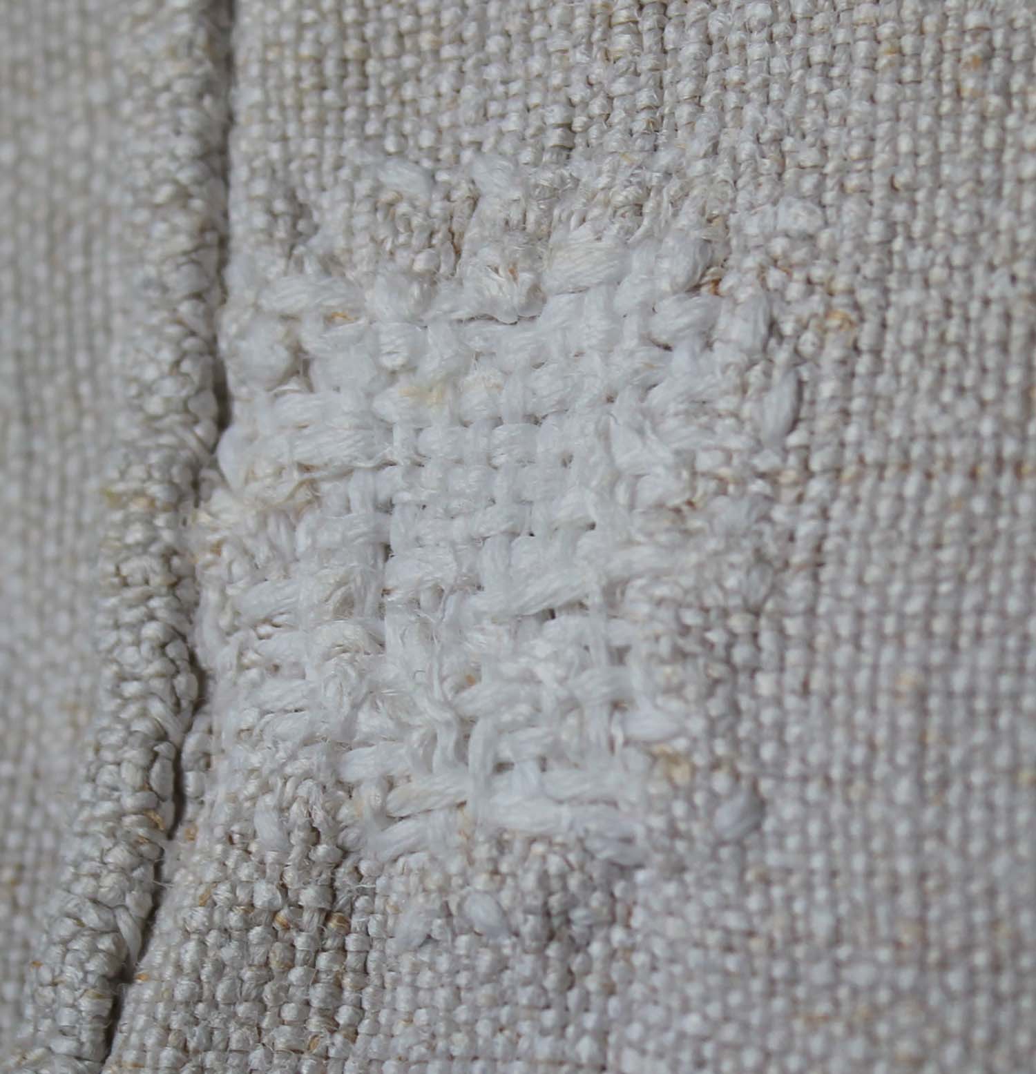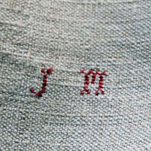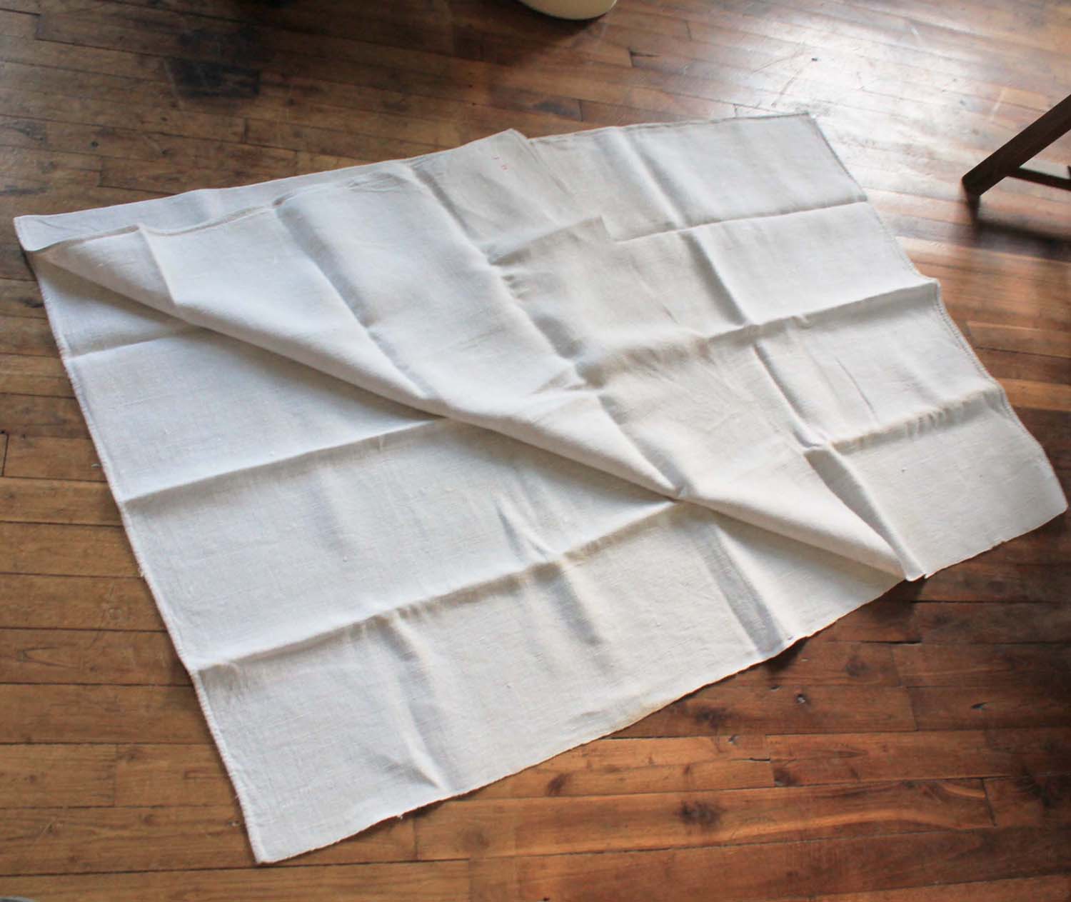 100年ぐらい前の古いホームスパンのシーツ。2枚の布がつながってできています。 赤いイニシャル刺しゅう入り。古いものなので汚れ、手で修繕が入っているところがあります。