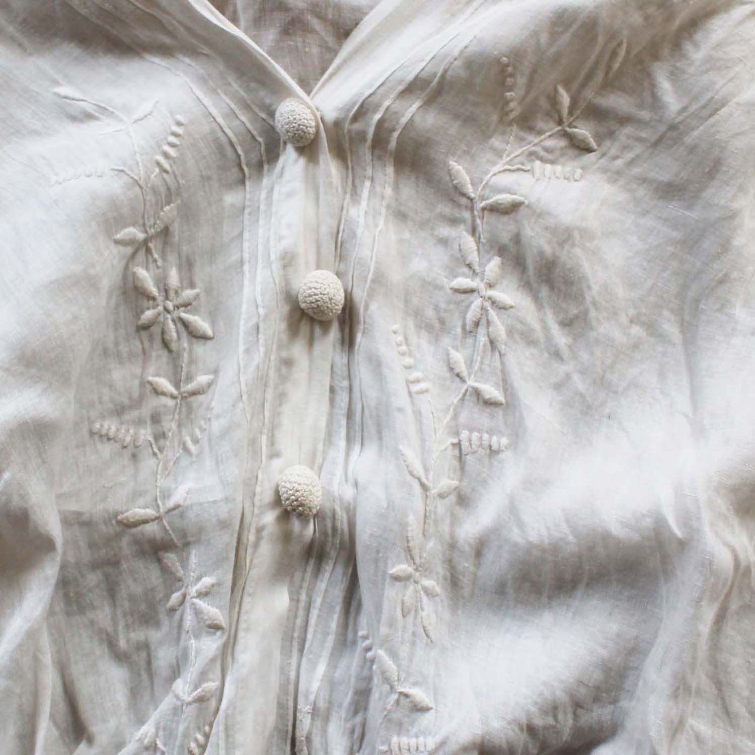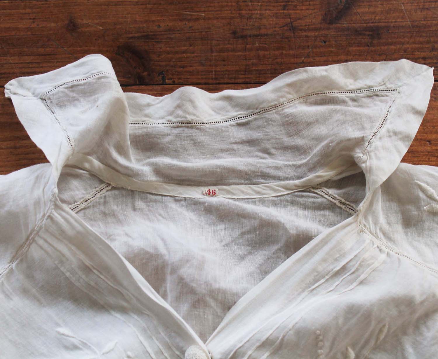 100年ぐらい前の古いコットン製のブラウス。 サイズは当時の46です。 ミシンは使われておらず、すべて手縫いになります。古いものなので多少のシミ、汚れがあります。