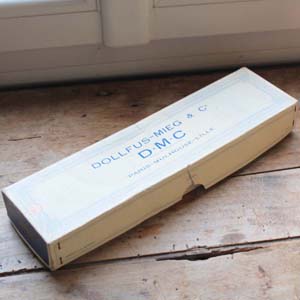 古いDMCの刺繍糸。Blanc Neige(白い雪)色です。デッドストックの糸が12本入っています。箱に多少ダメージがあります。