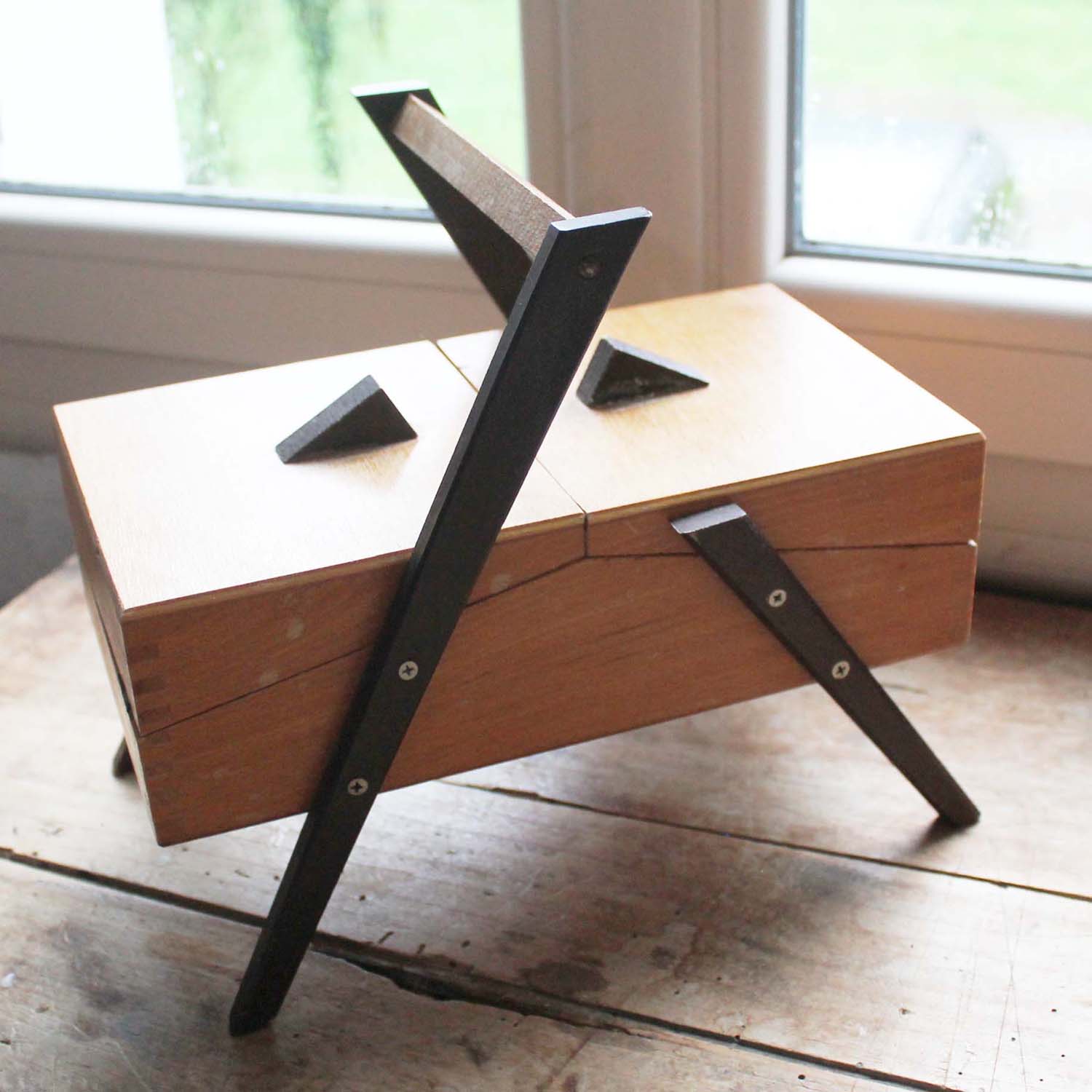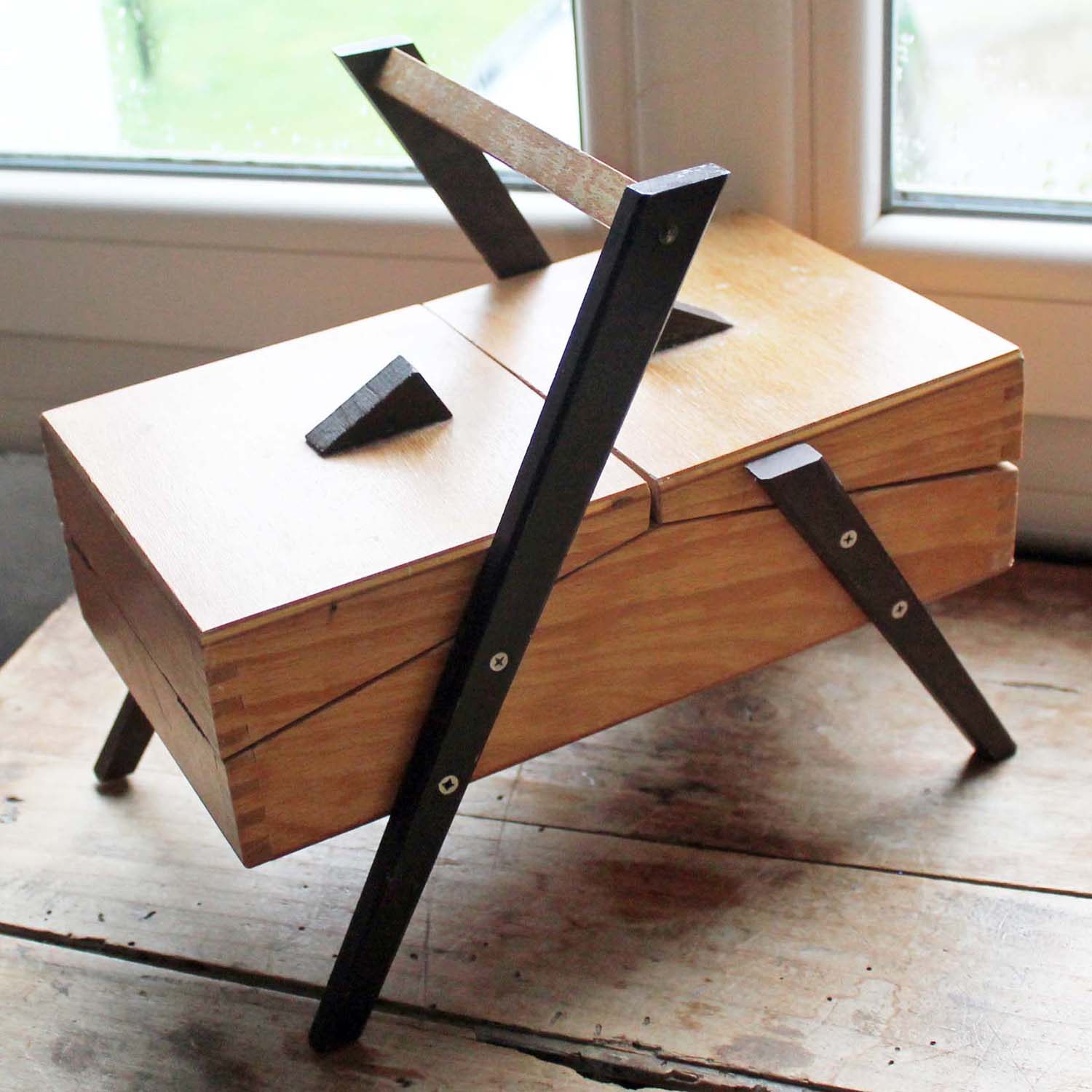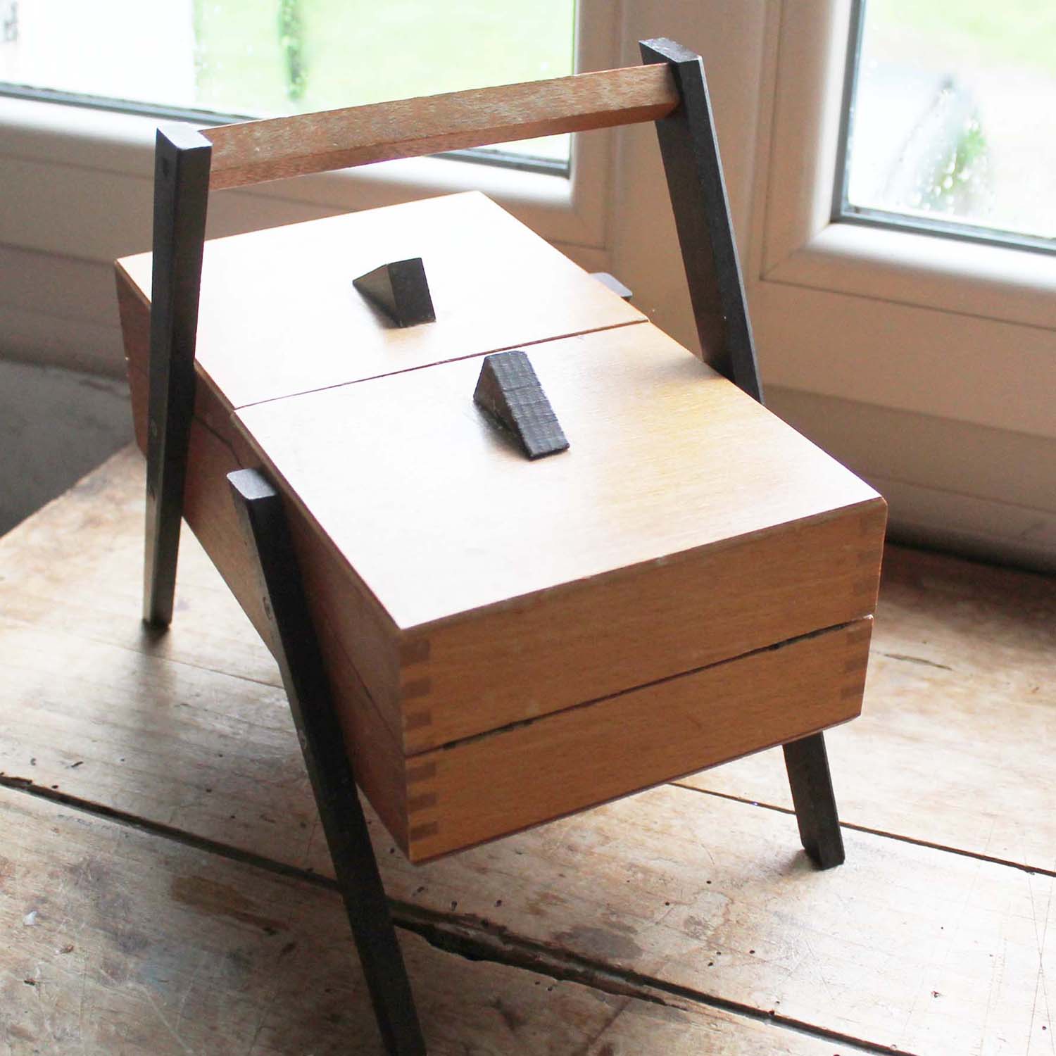 1960年代特有のデザインがシックなソーイングボックス。古いものなので多少の傷、汚れがあります。