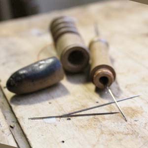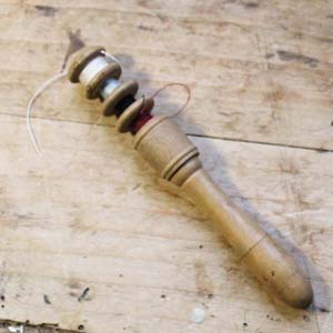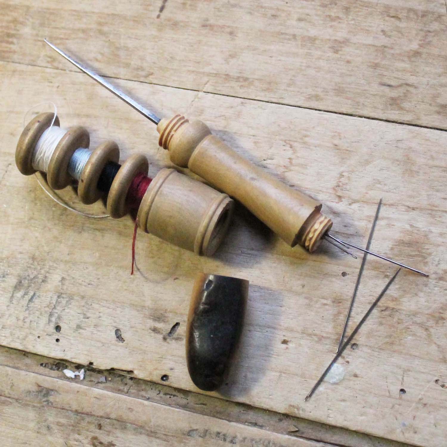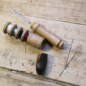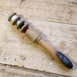 古いフランス軍用の携帯用ソーイングセット。 糸4種、目打ち、針がセットになっています。古いものなので持ち手に焦げがあります。