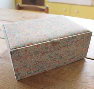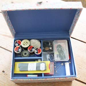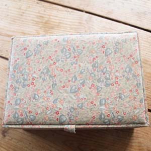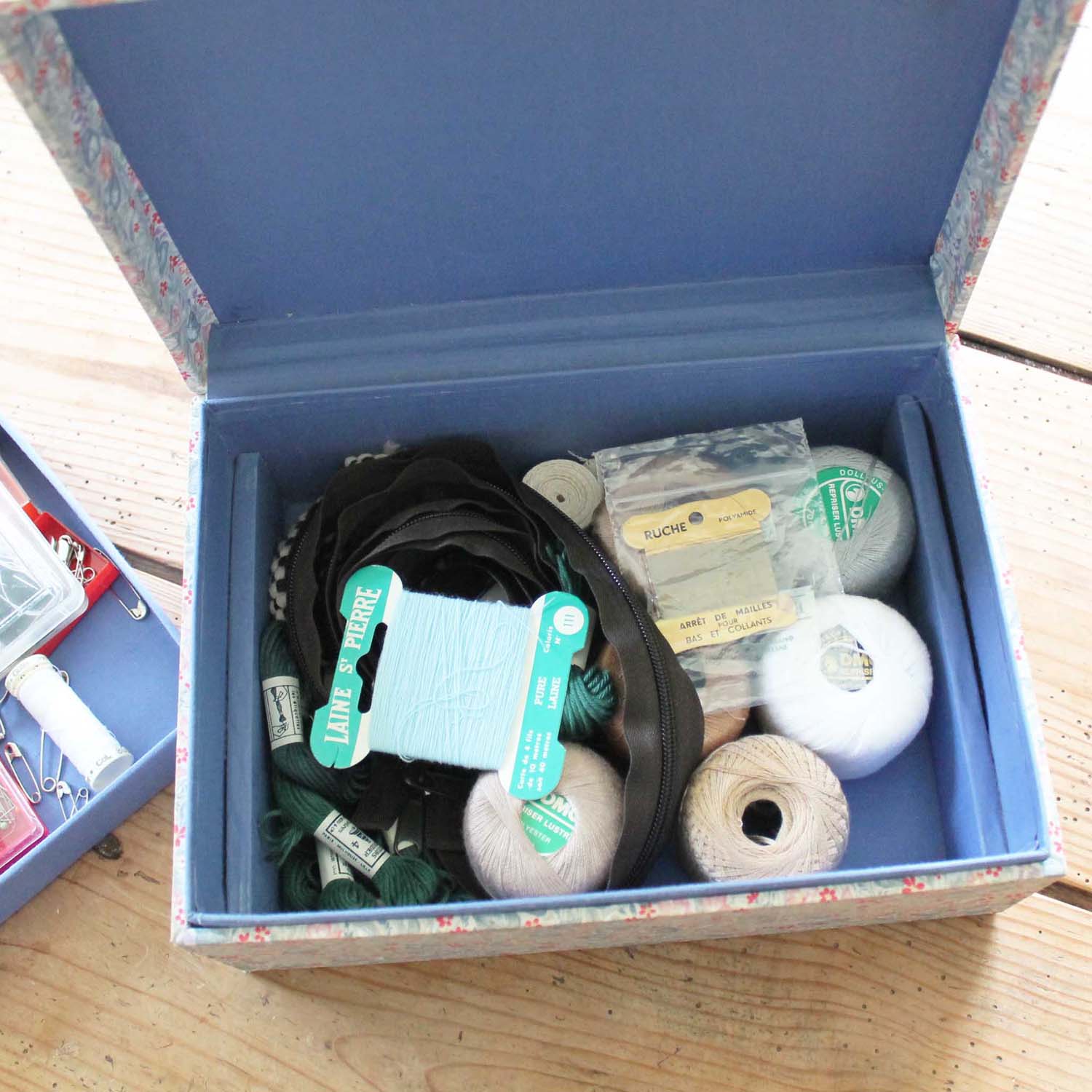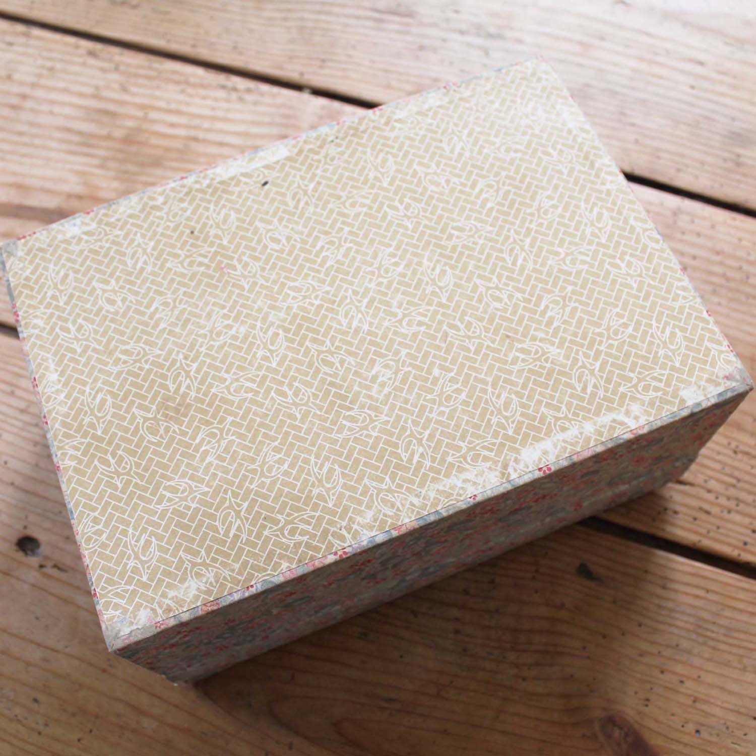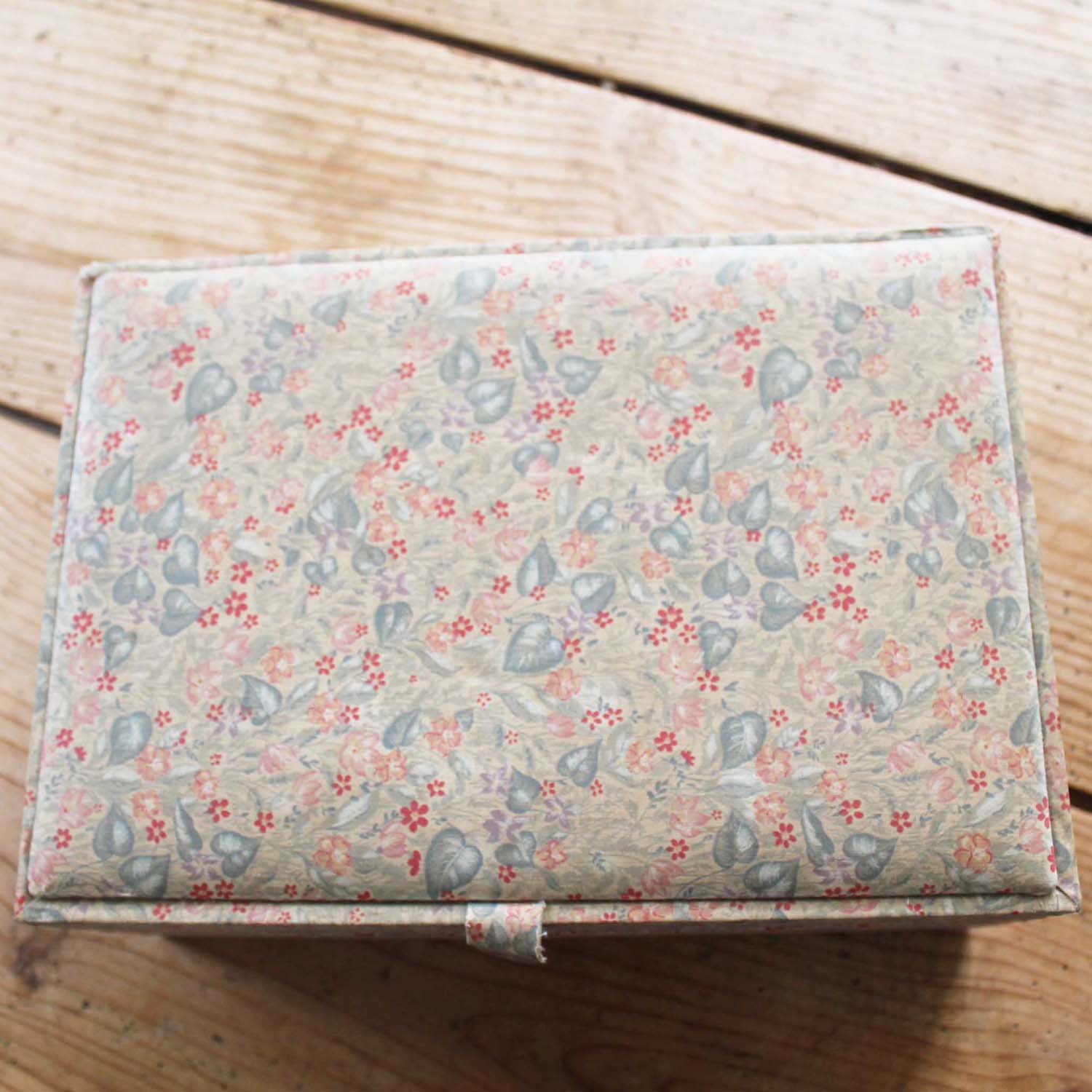 中にそのままソーインググッズが入っているカルトナージュのボックス。古いものなので多少傷、汚れ、シミがあります。中身込みでの販売です。