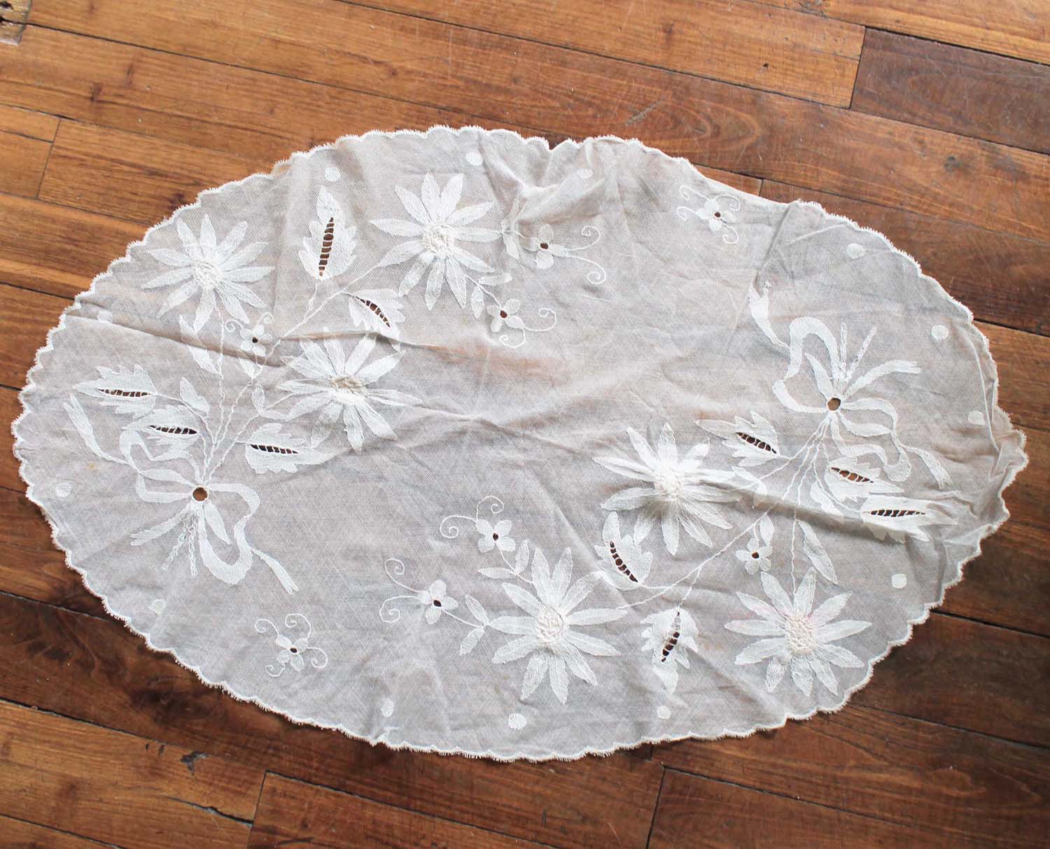 古い手刺繍入りのテーブルセンター。古いものなので汚れがあります。