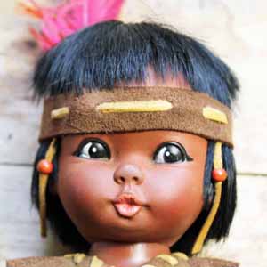 カナダの超有名なおもちゃメーカー、Reliable社製のインディアンの人形。1967年製です(マーク入り)。 ボディーはプラスティックですが、服は本革です。古いものですが、コレクションだったそうで、とてもきれいです。