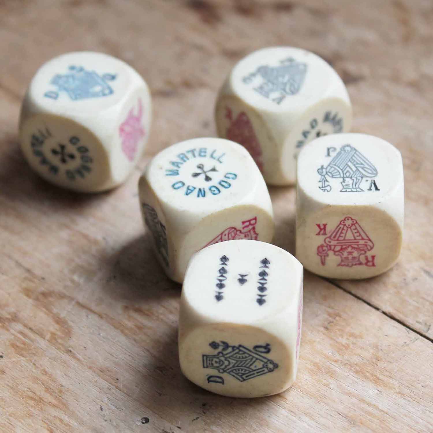 ヴィンテージのポーカー用のさいころ。 コニャック会社のMartellのマークが入っています。古いものなので傷、汚れがあります。