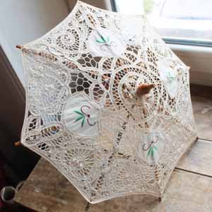 古いおもちゃの日傘。 レース部分は手刺です。ふるいものなので、骨の一本に修繕が入っていますが、使用に問題ありません。