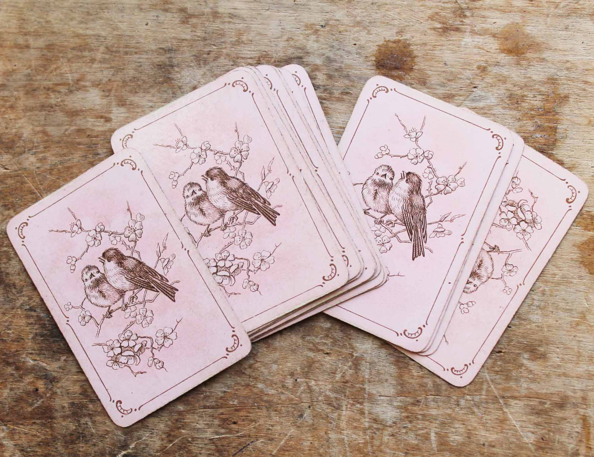 古い小さなトランプ。 裏の絵柄が鳥柄のかわいいものです。古いものなのでカードの折れ、切れがありますが、カードの数はジョーカー以外すべてそろっています。
