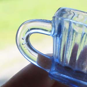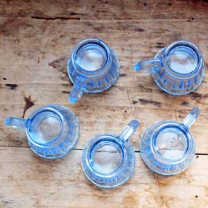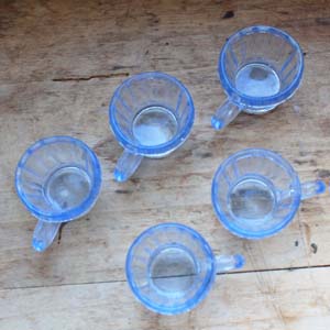 ガラス製の小さなカップ5個セット。方吹きグラス製なので、気泡やガラスのよれがありますが、欠け、ラインはありません。