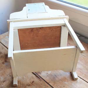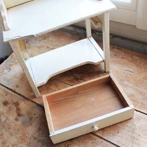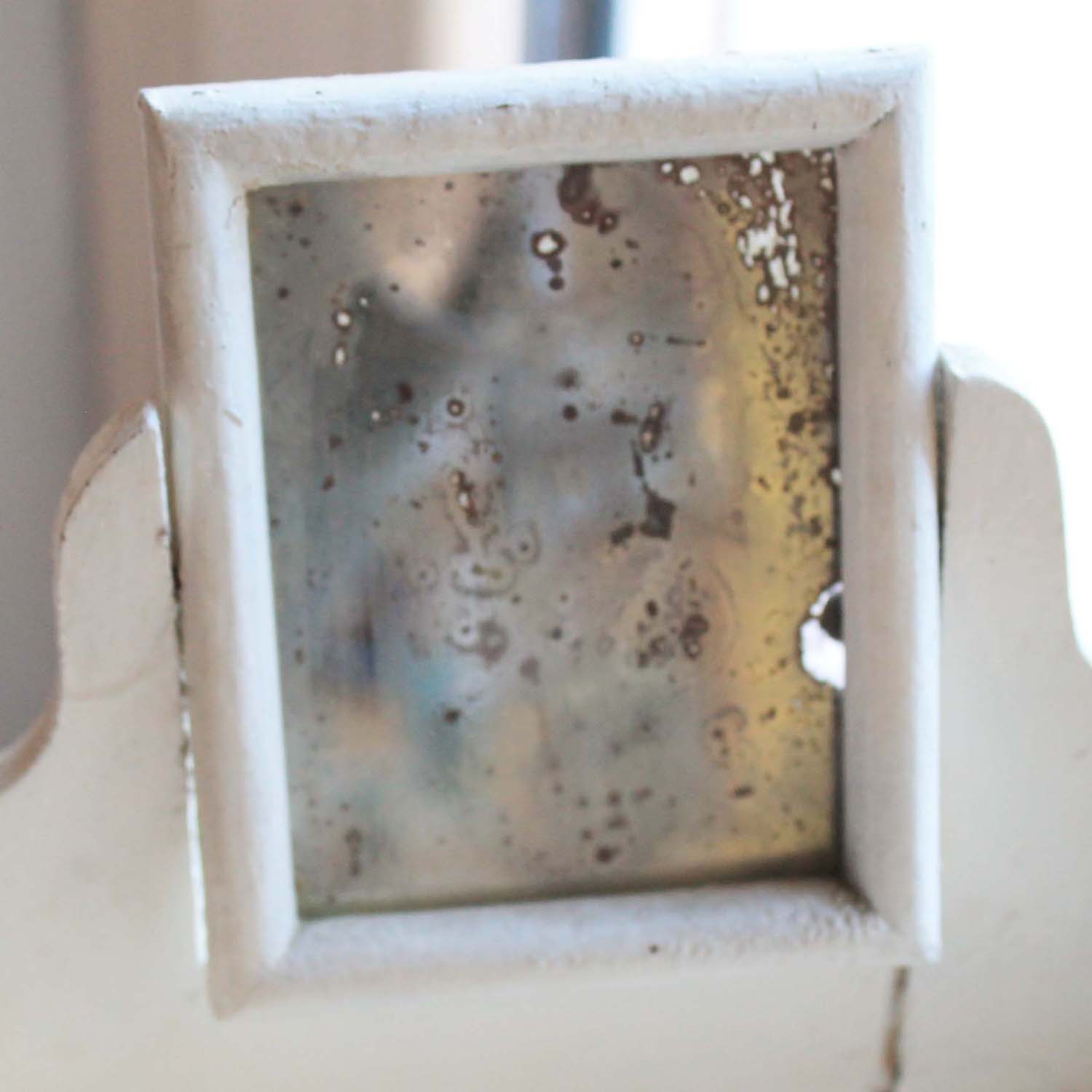 100年近く前の古い木製のおもちゃの鏡台。鏡には曇りが入っています。古いものなので木の割れがあります。