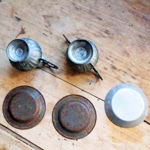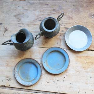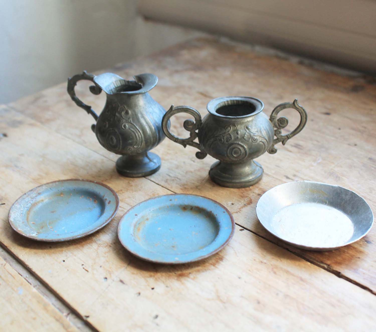100年近く前の古いおままごとセット。金属製です。古いものなので傷、汚れ、割れなどがあります。