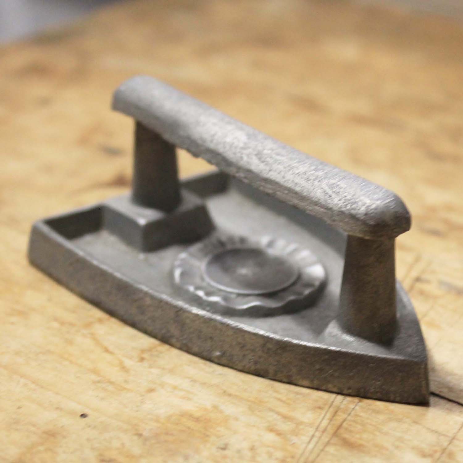 古いアルミ製の小さなアイロン。古いものなので多少jの傷、汚れがあります。