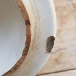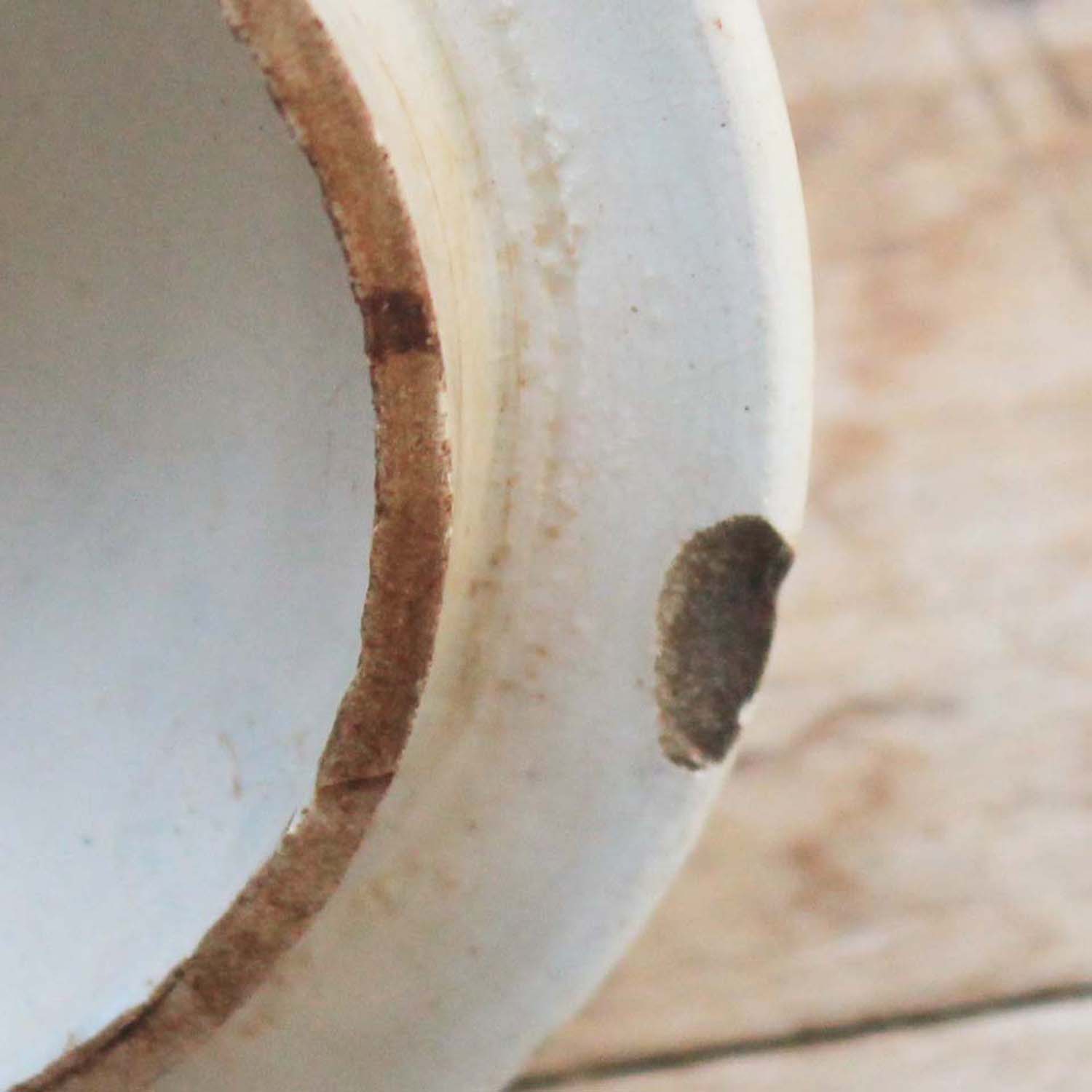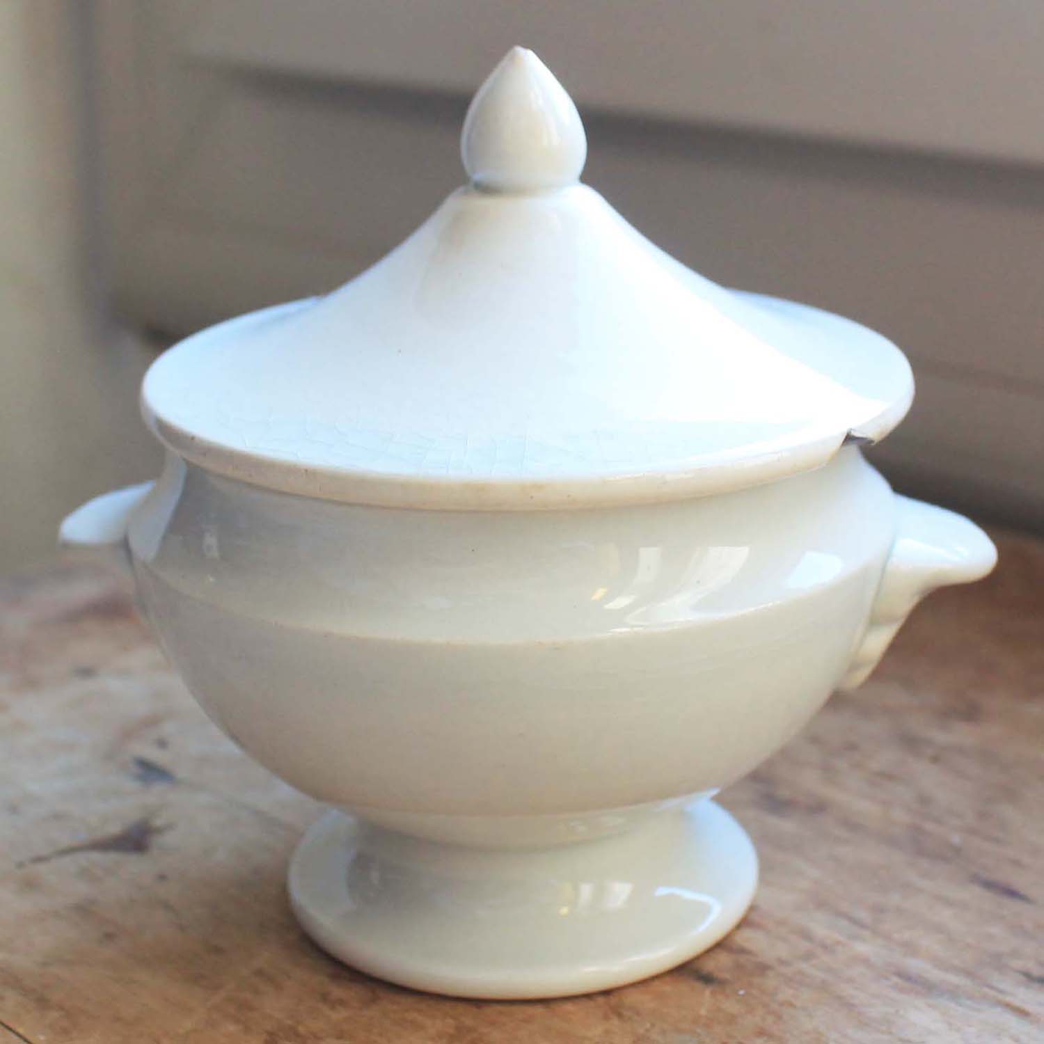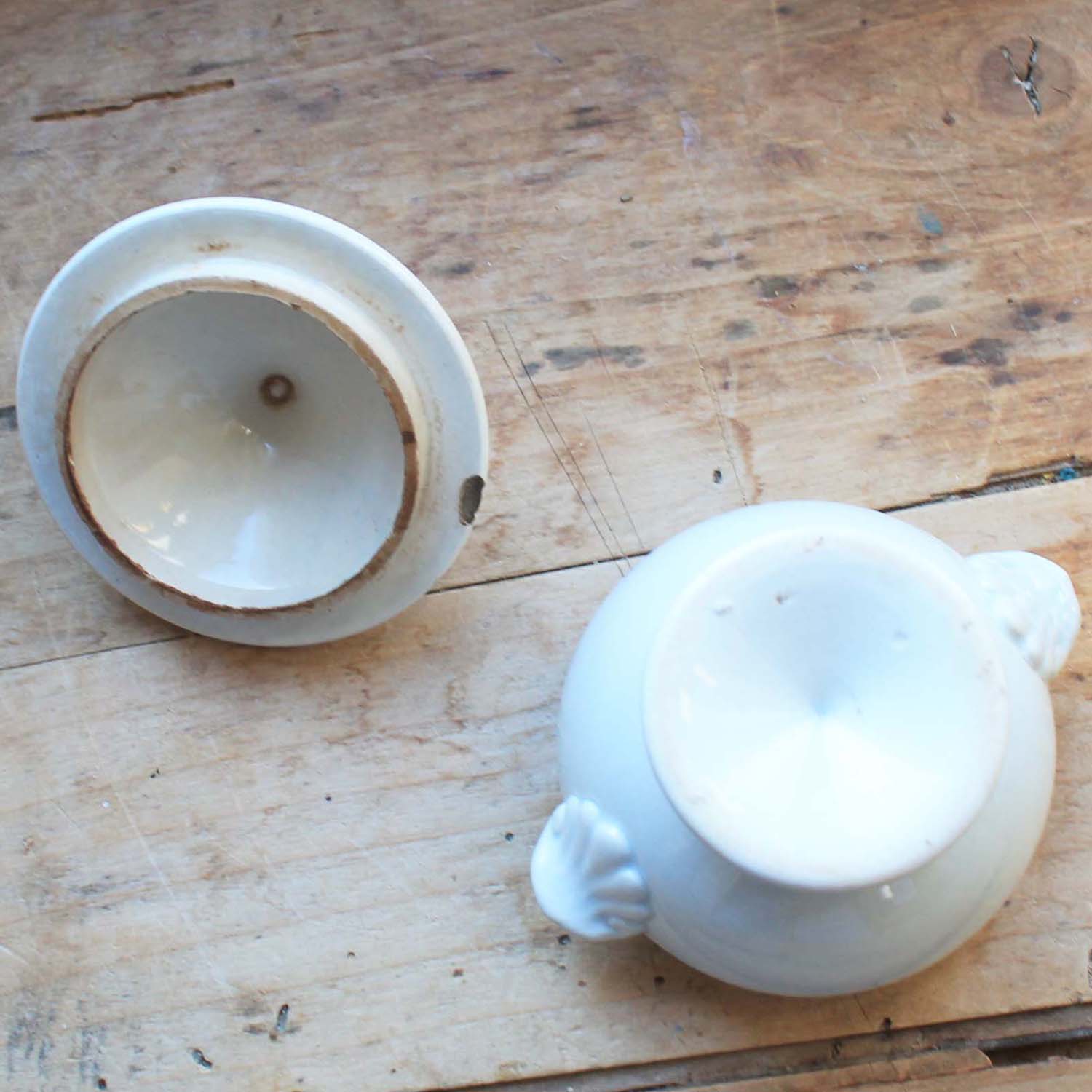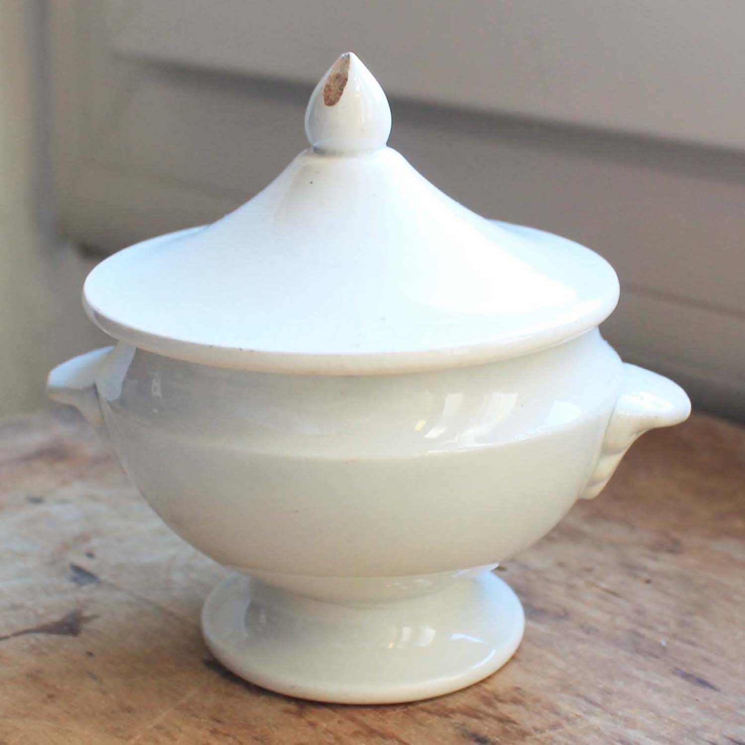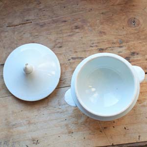 100年以上前の古いおもちゃのスーピエール。陶器製です。古いものなので蓋にダメージがありますが、本体はきれいです。