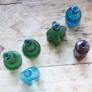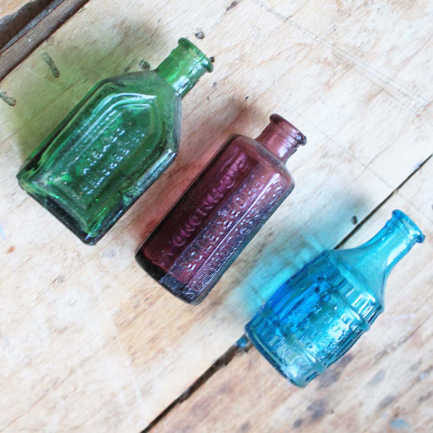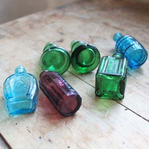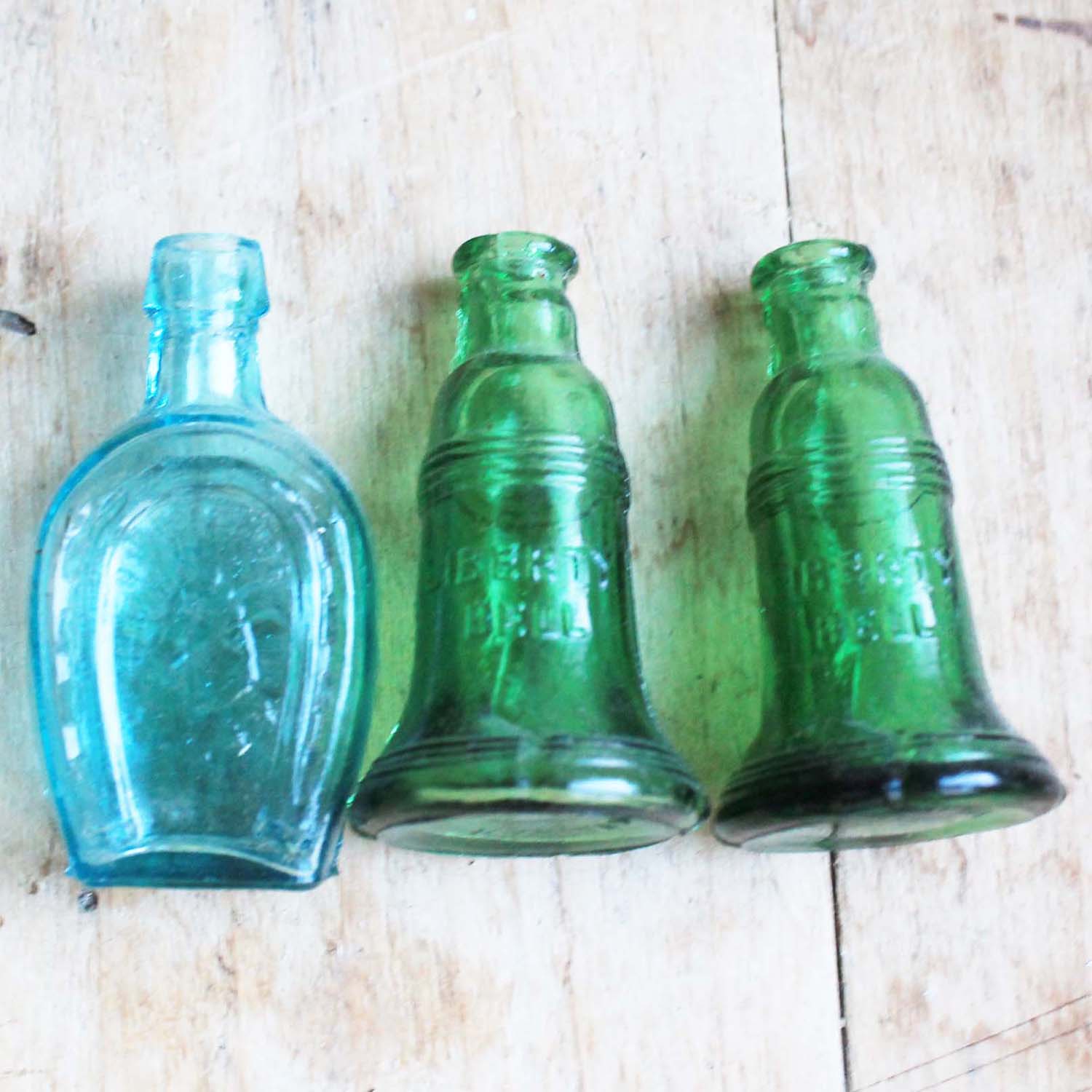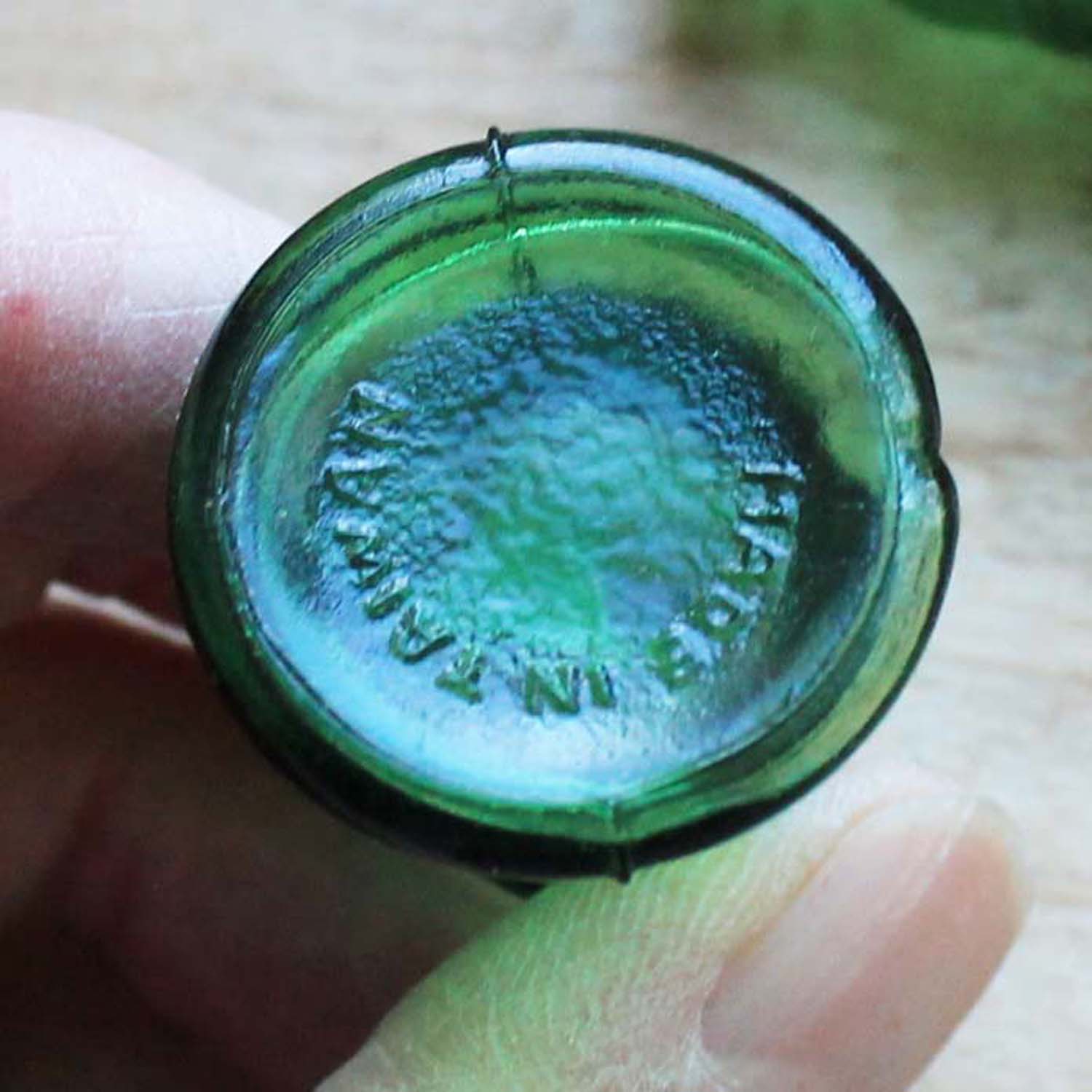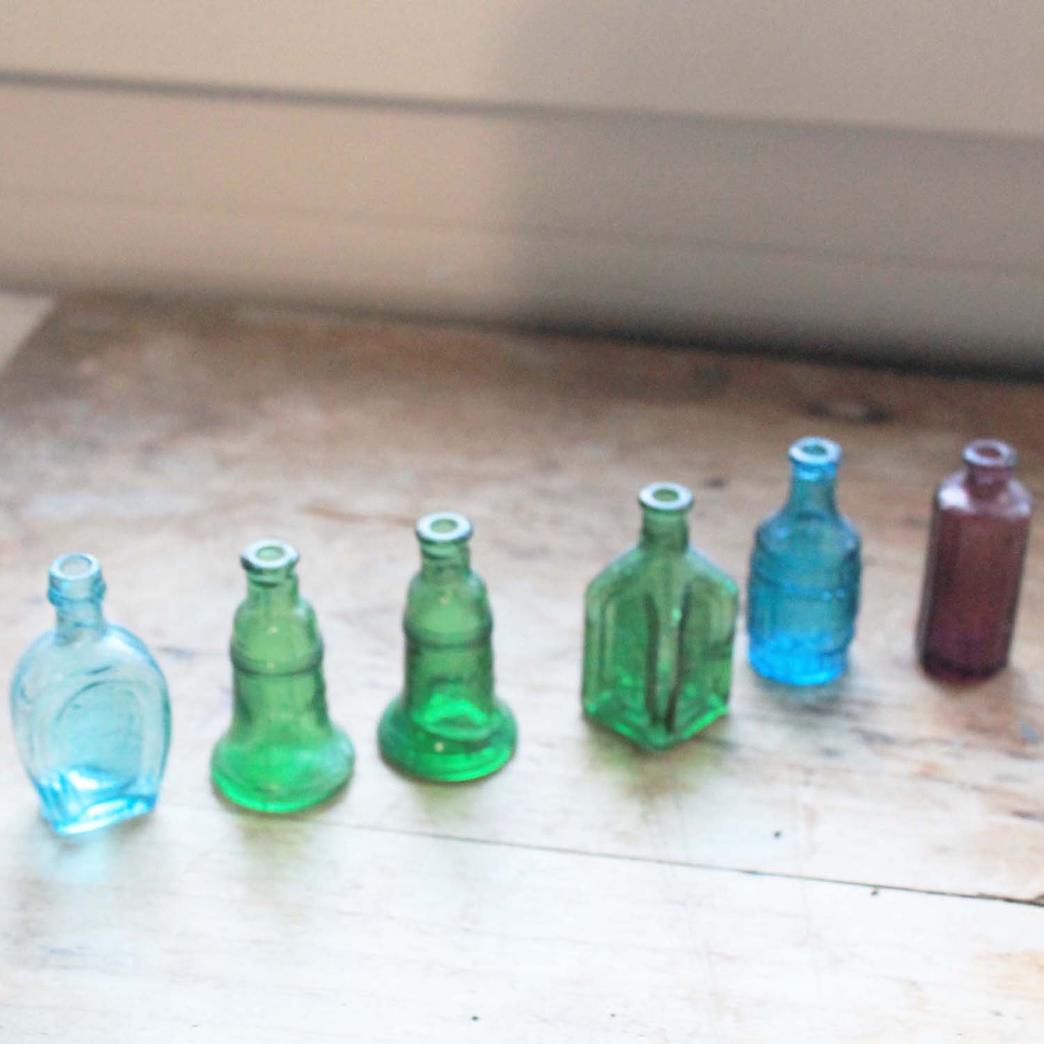 古い台湾製のおもちゃのボトルセット、ボトルには英語が書かれており、海外輸出用です。型吹きガラス製のなので、気泡、ガラスのよれがあります。古いものですが、欠け、ラインはありません。