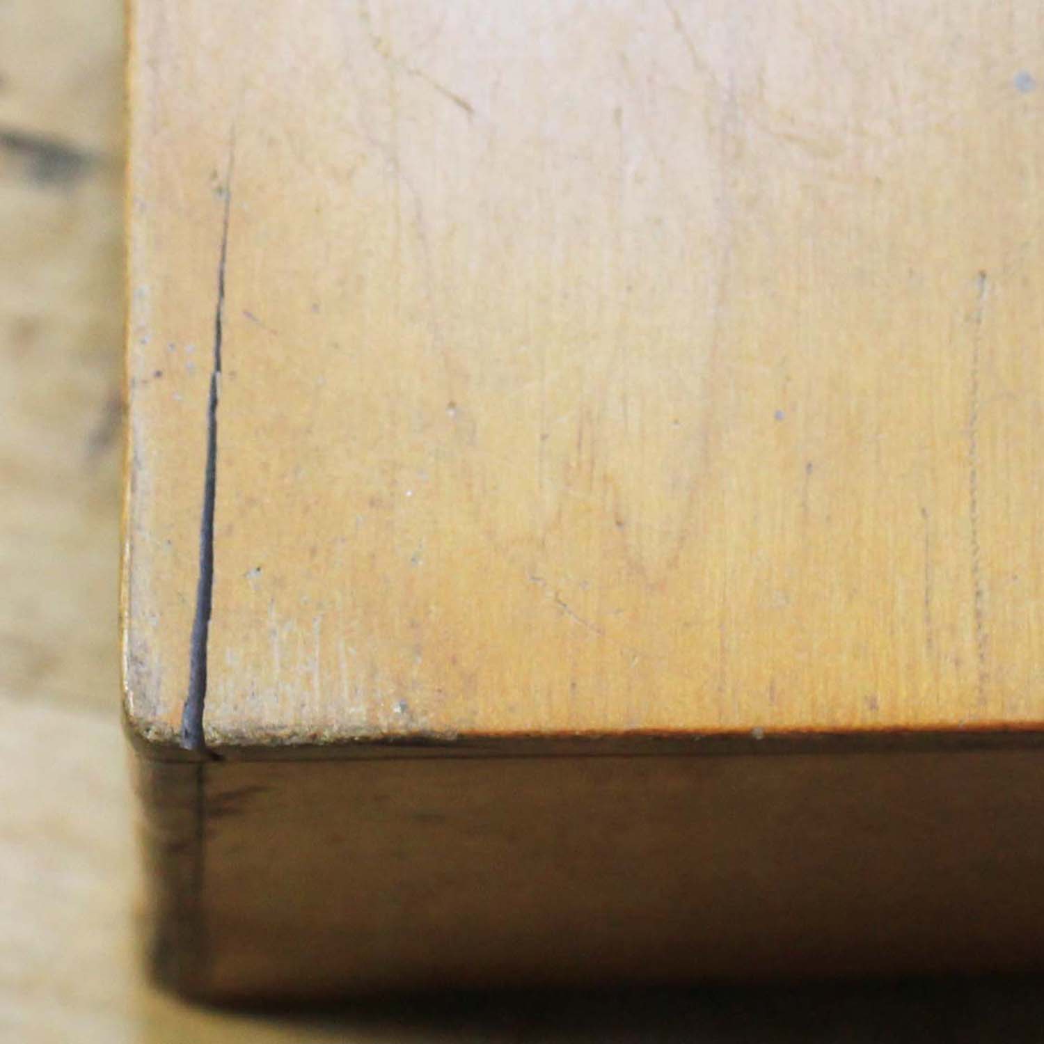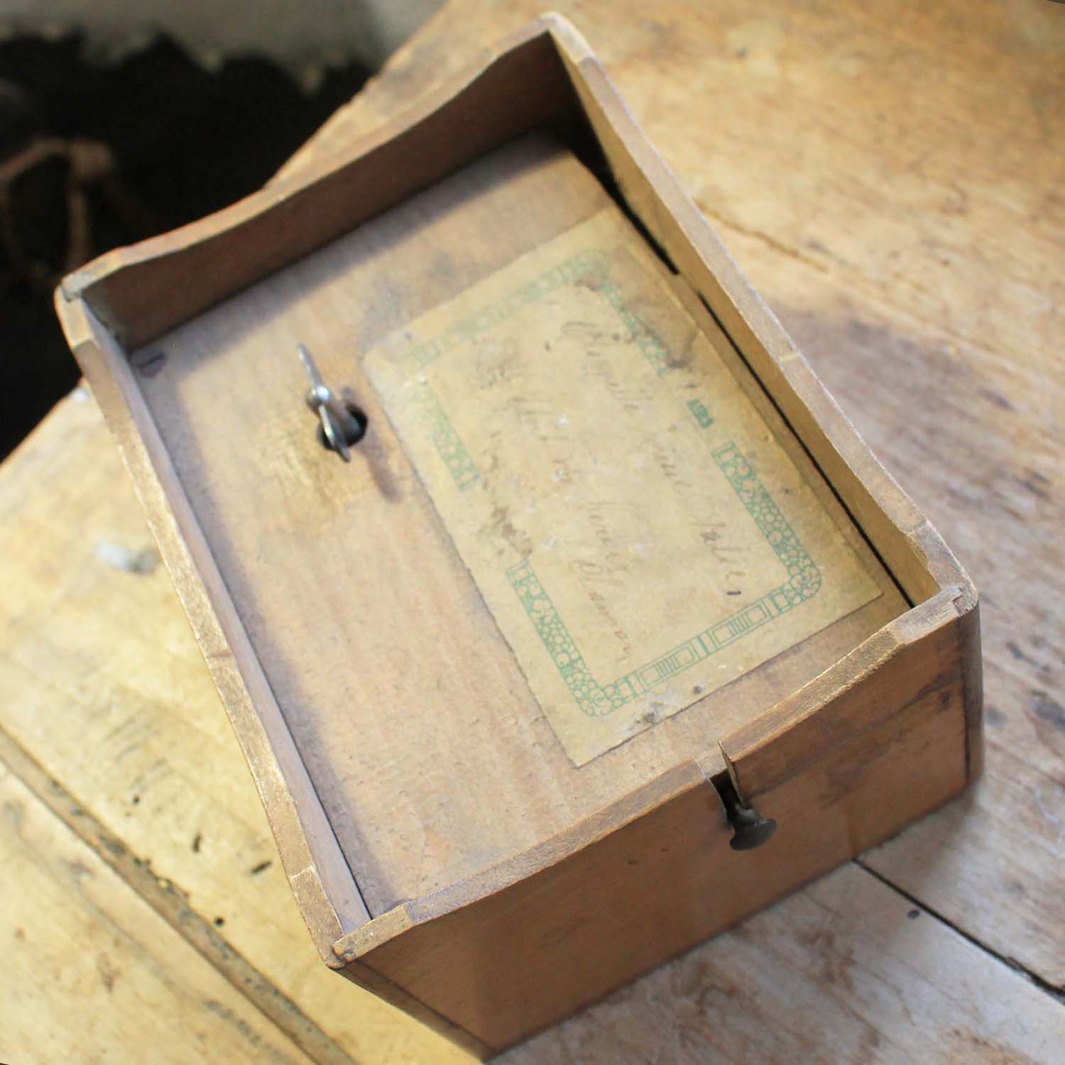 裏に当時のラベルがまだついている古いオルゴール。 箱の上に2つあながあいているのでここに何かあったのではないかと思いますが、無くても問題なくオルゴールを聞くことができます。古いものなので多少の傷、汚れ、木の割れがあります。