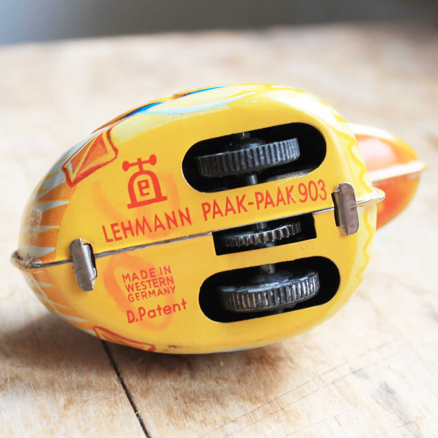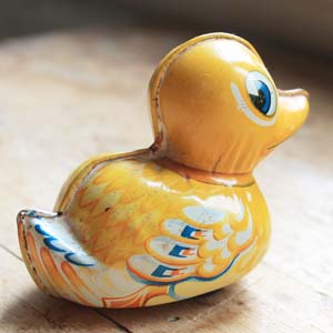 今はない西ドイツ製の子アヒルのおもちゃ。Lehmann社製です。ローラーを動かすことで走ります。古いものなので多少の傷、汚れがあります。