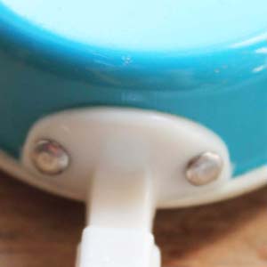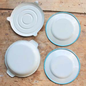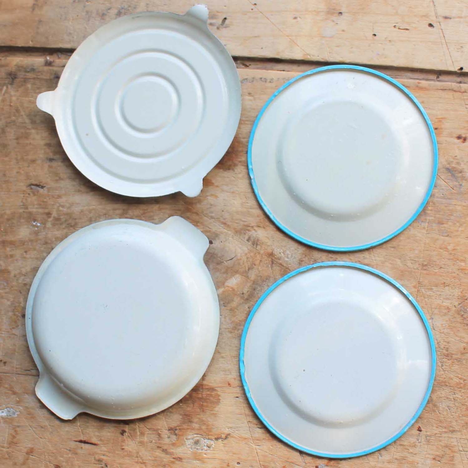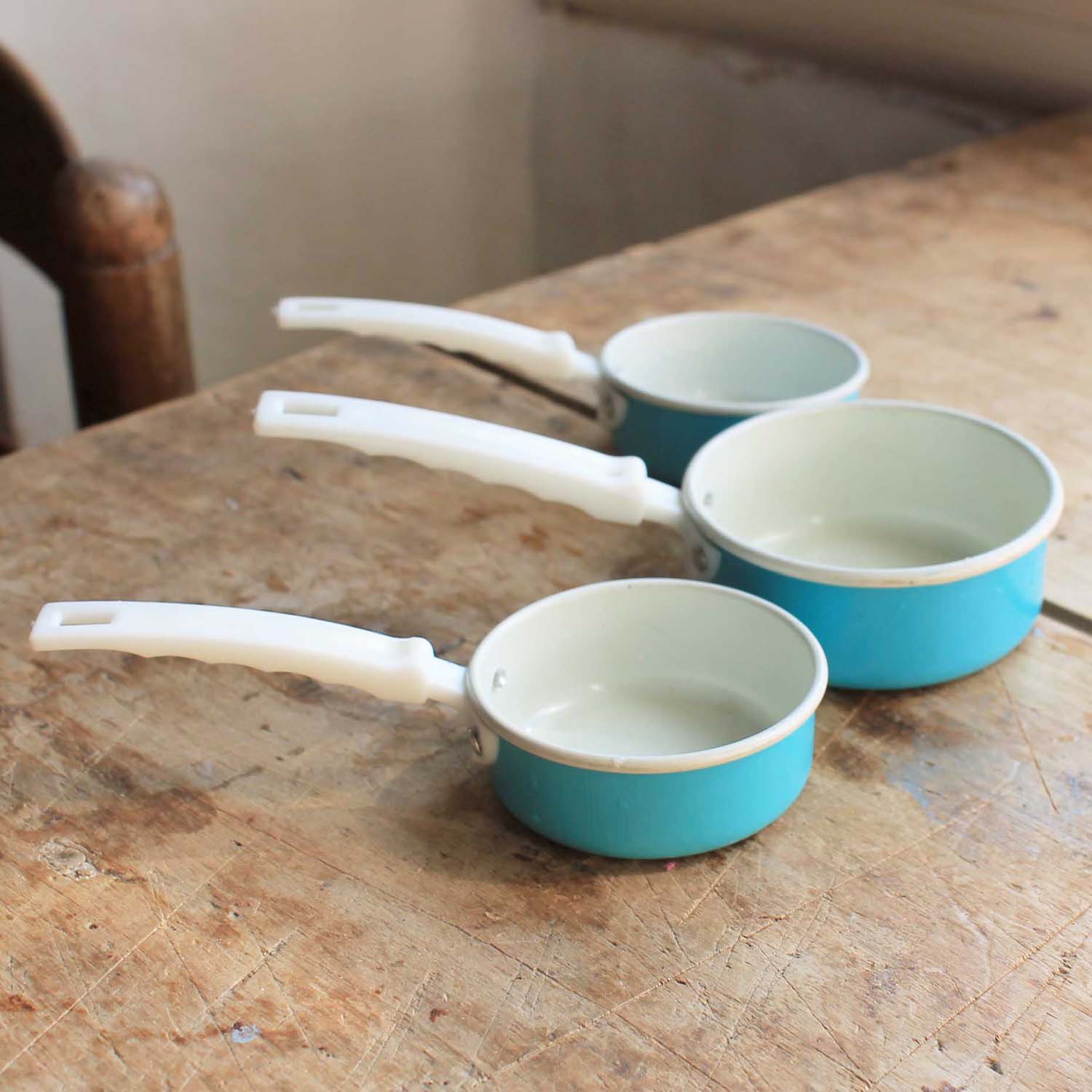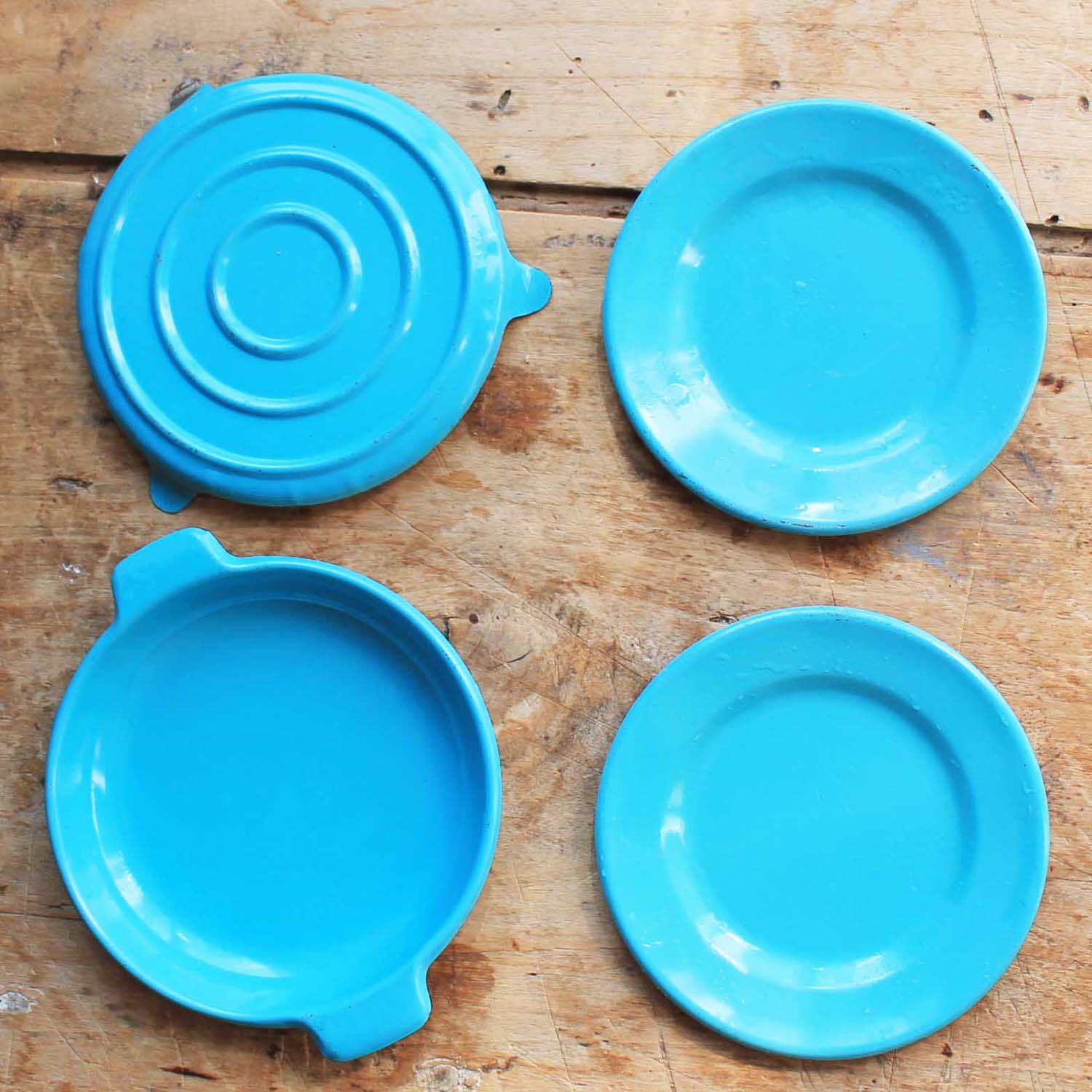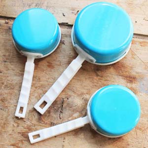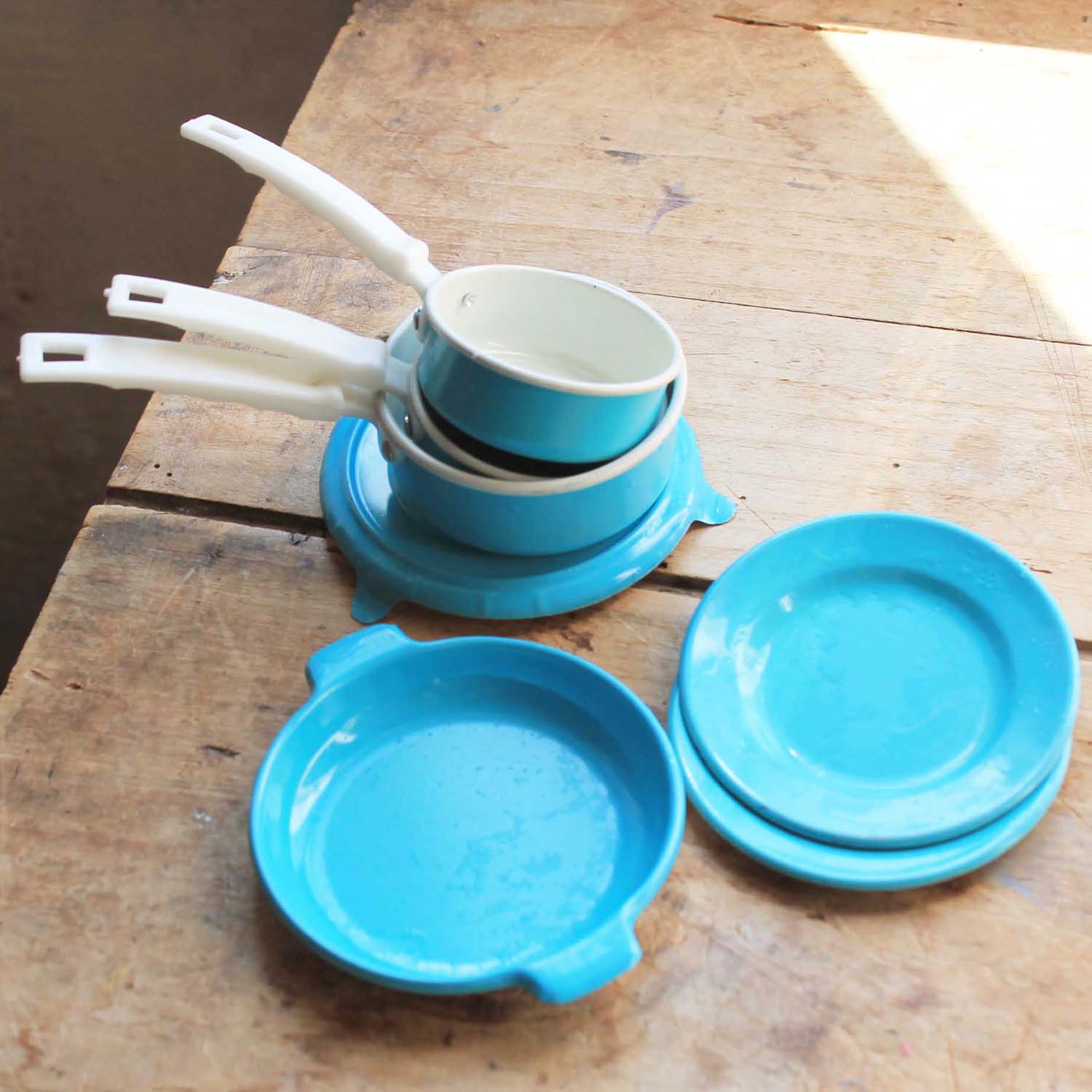 古いアルミ製のおもちゃのキッチングッズ。6個セットです。持ち手はプラスティック製です。傷、汚れ、ゆがみがあります。