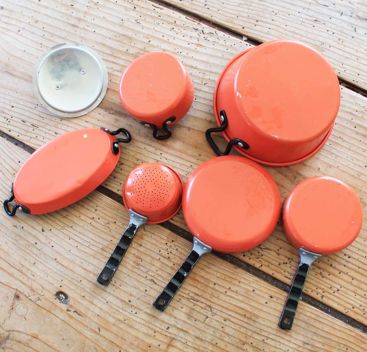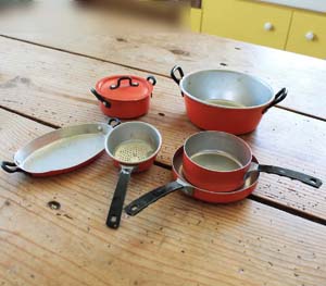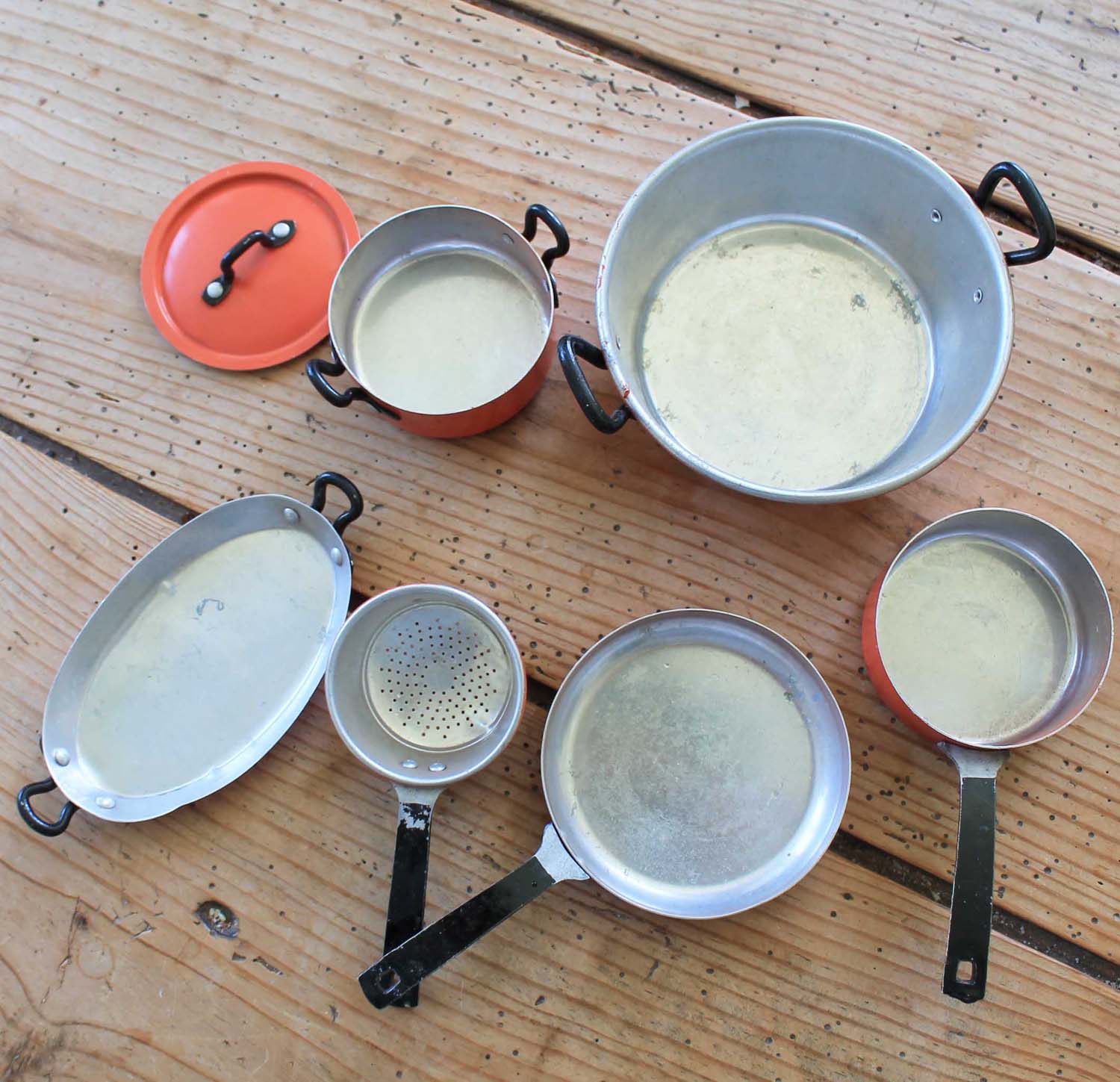 古いアルミ製のおもちゃのキッチングッズ。6個セットです.。古い物なので傷、汚れ、ゆがみがあります。